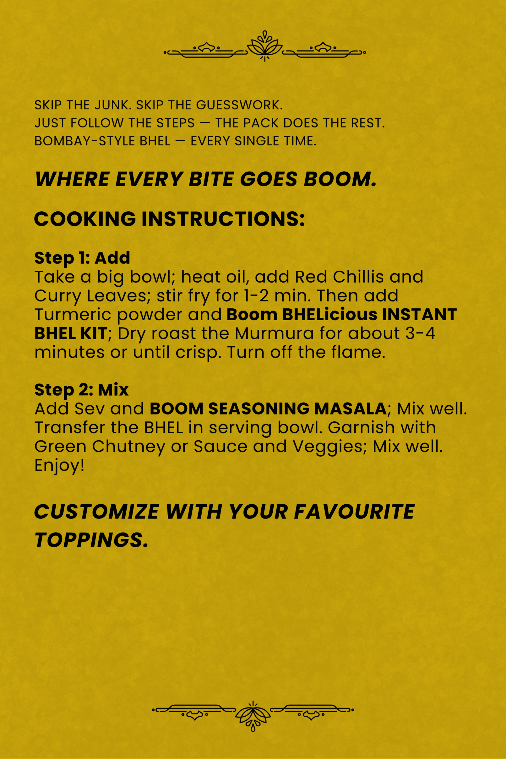 Add Sev and Boom BHELicious SEASONING MASALA; Mix well. Transfer the BHEL in serving bowl. Garnish with Green Chutney or Sauce and Veggies; Mix well. Enjoy!