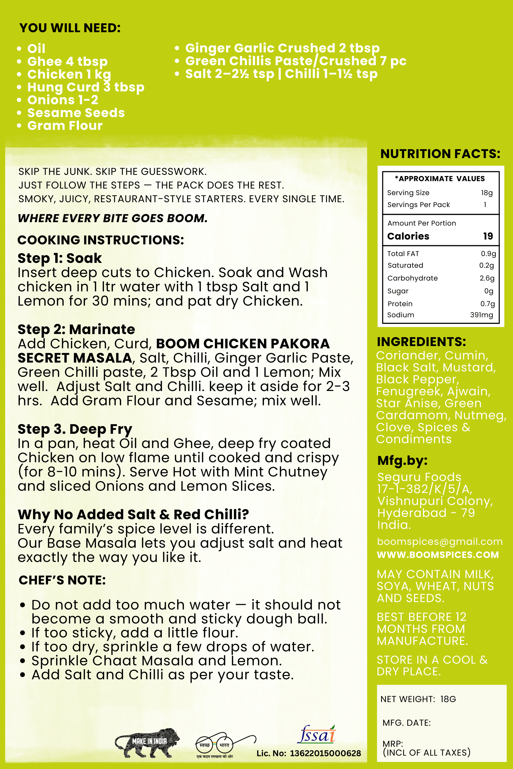 Add Chicken, Curd, BOOM CHICKEN PAKORA SECRET MASALA, Salt, Chilli, Ginger Garlic Paste, Green Chilli paste, 2 Tbsp Oil and 1 Lemon; Mix well. Adjust Salt and Chilli. keep it aside for 2-3 hrs. Add Gram Flour and Sesame; mix well.