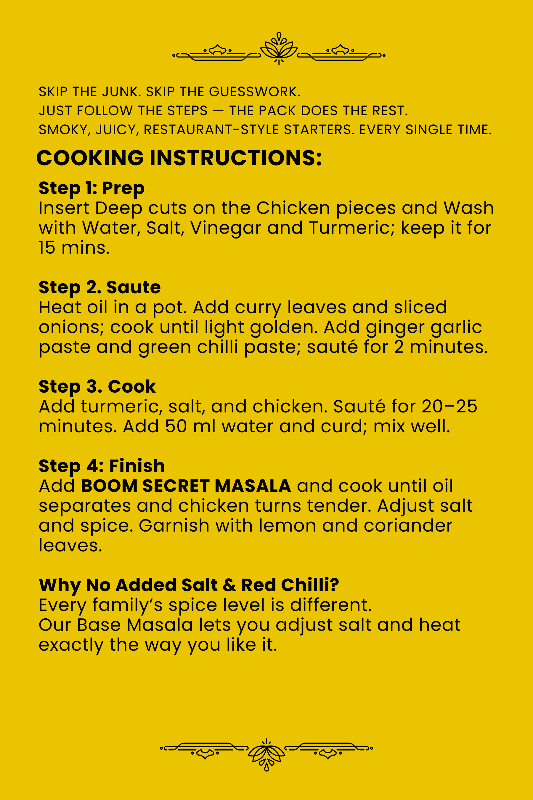 Our Base Masala lets you adjust salt and heat exactly the way you like it.