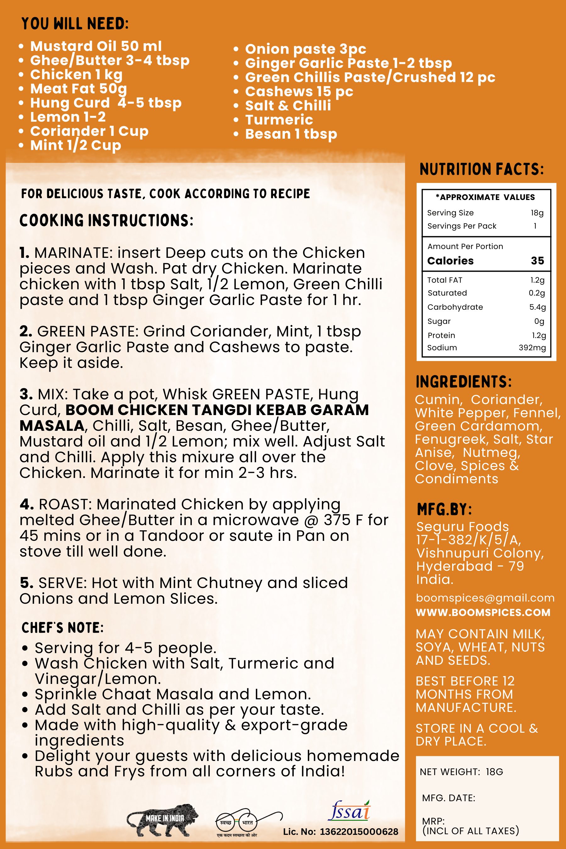 In a bowl, whisk together the green paste, hung curd, BOOM Chicken Tangdi Kebab Garam Masala, red chilli powder, salt, roasted besan (gram flour), ghee or melted butter, mustard oil, and juice of ½ lemon. Mix well. Apply this marinade generously over the pre-marinated chicken, making sure it gets into all the cuts. Marinate for at least 2–3 hours (overnight is best for deeper flavor).