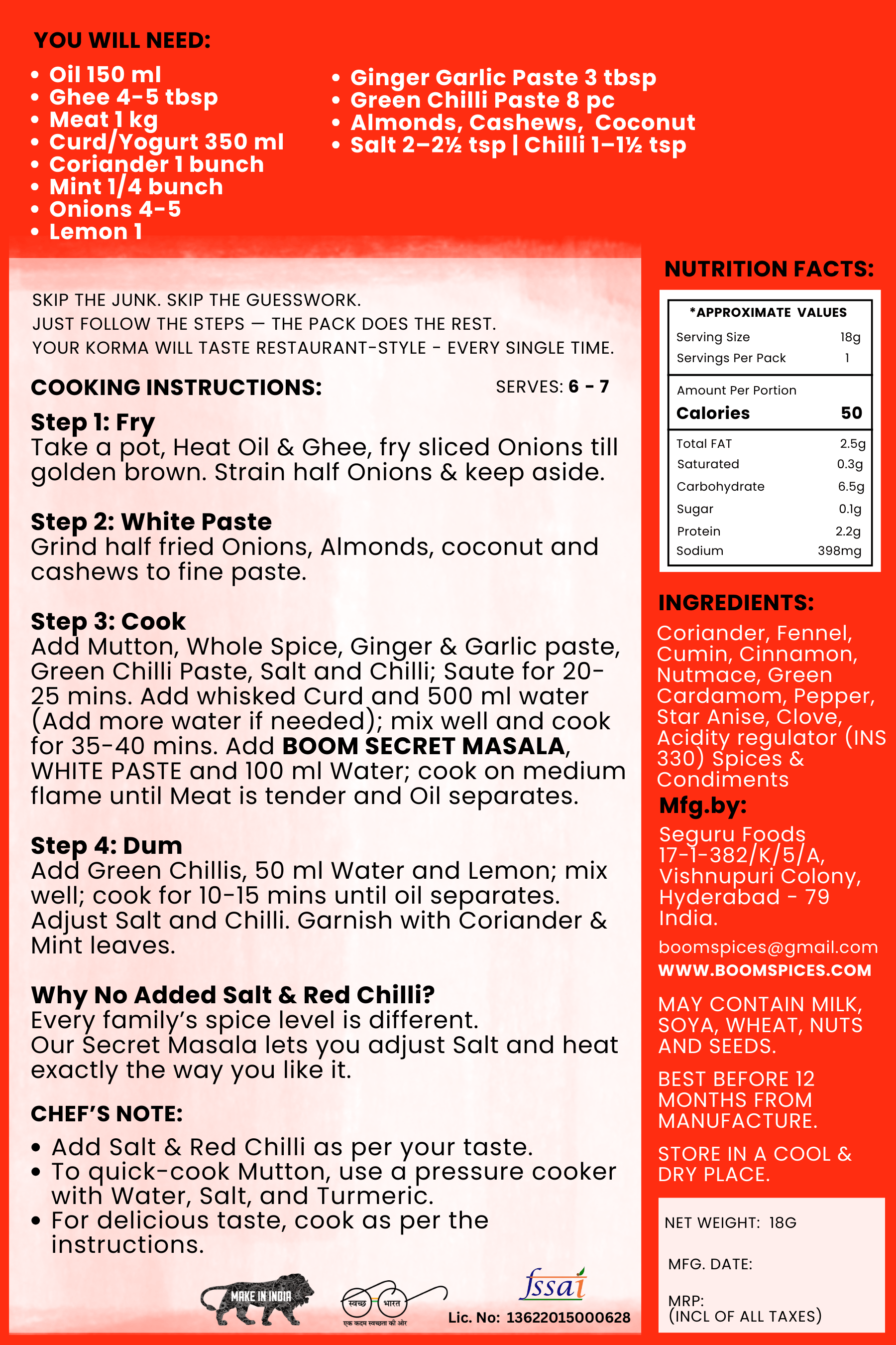 Add Mutton, Whole Spice, Ginger & Garlic paste, Green Chilli Paste, Salt and Chilli; Saute for 20-25 mins. Add whisked Curd and 500 ml water (Add more water if needed); mix well and cook for 35-40 mins. Add BOOM MUTTON KORMA SECRET MASALA, WHITE PASTE and 100 ml Water; cook on medium flame until Meat is tender and Oil separates.