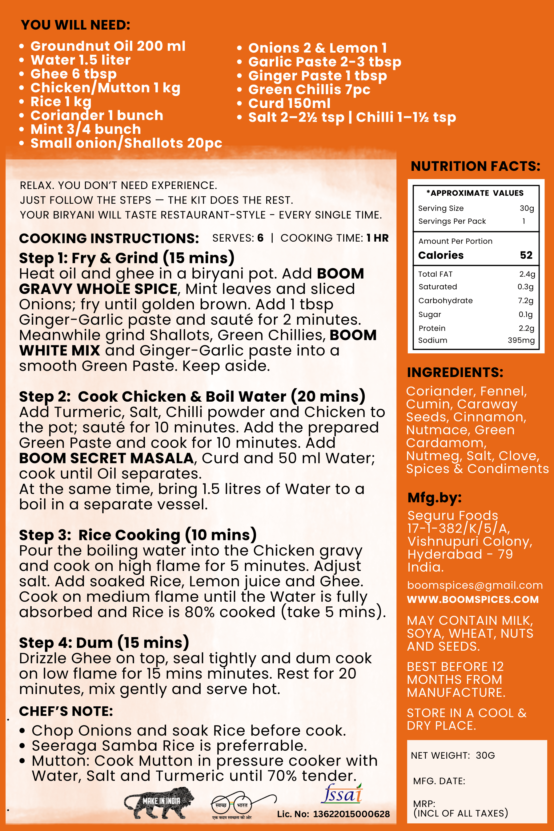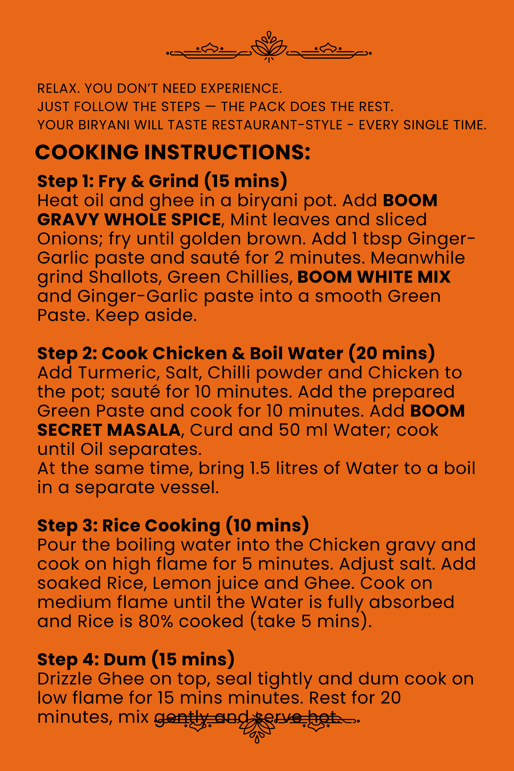 Heat oil and ghee in a biryani pot. Add BOOM GRAVY WHOLE SPICE, Mint leaves and sliced Onions; fry until golden brown. Add 1 tbsp Ginger-Garlic paste and sauté for 2 minutes. Meanwhile grind Shallots, Green Chillies, BOOM WHITE MIX and Ginger-Garlic paste into a smooth Green Paste. Keep aside.