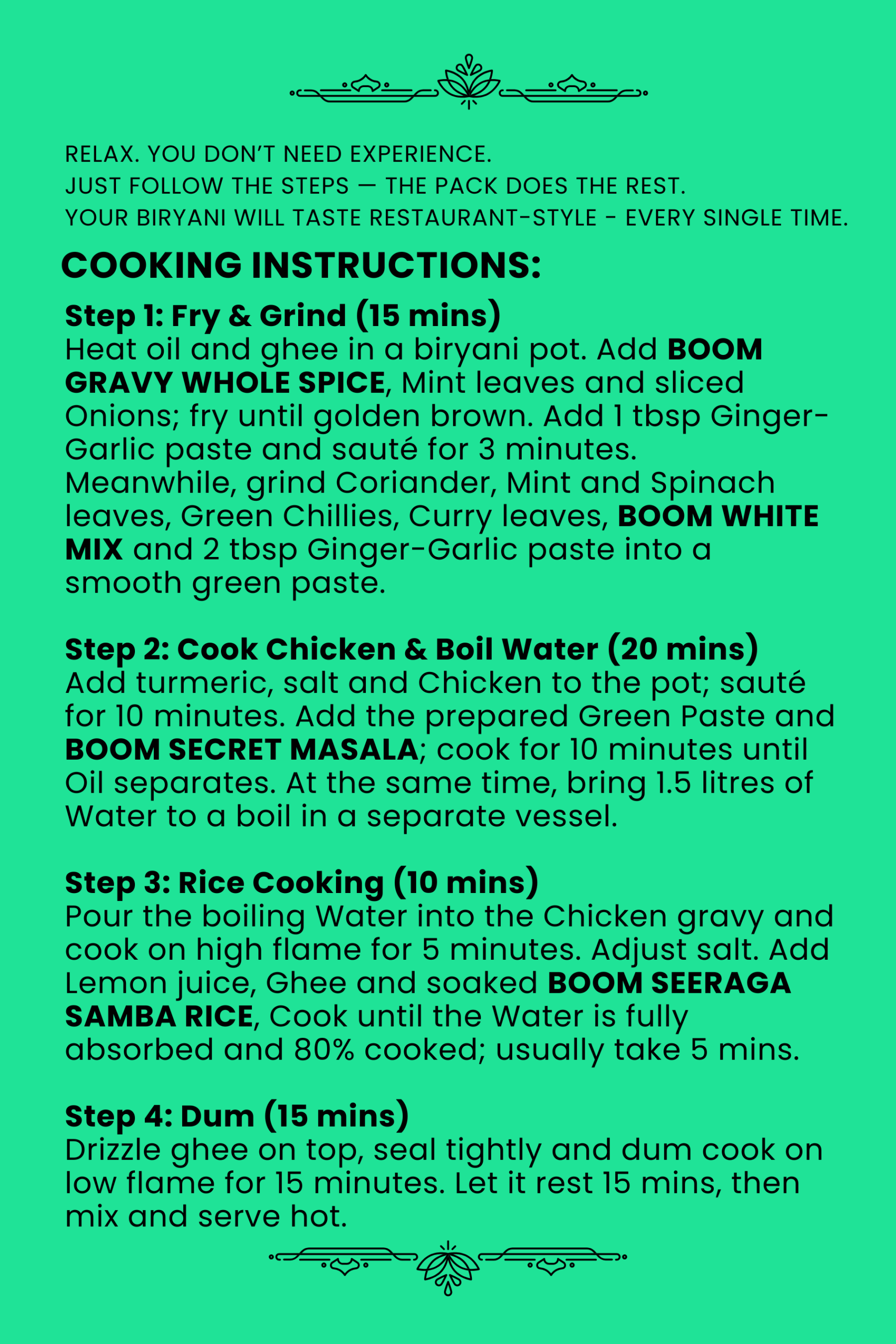 Add turmeric, salt and Chicken to the pot; sauté for 10 minutes. Add the prepared Green Paste and BOOM SECRET MASALA; cook for 10 minutes cook until Oil separates. At the same time, bring 1.5 liters of Water to a boil in a separate vessel.