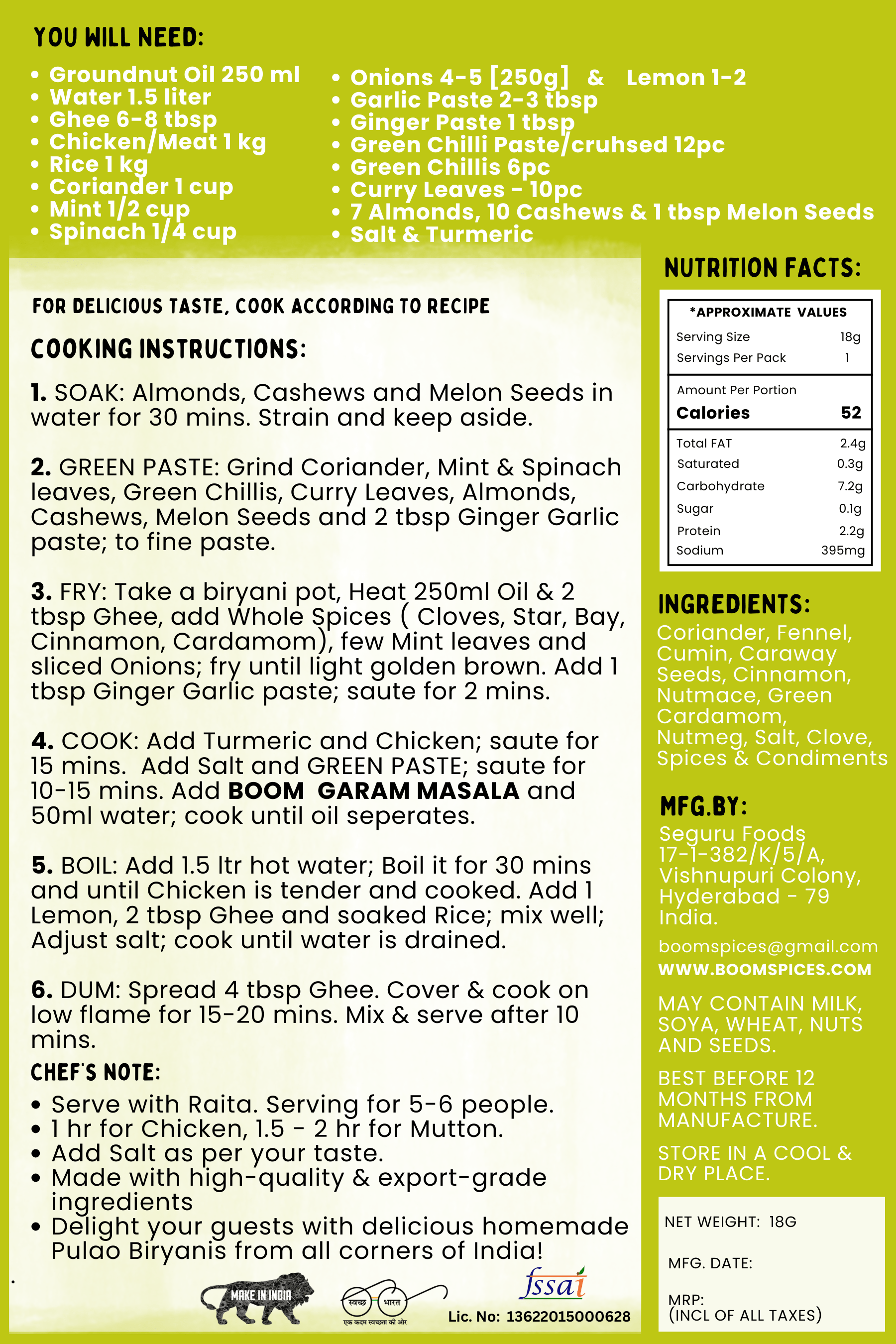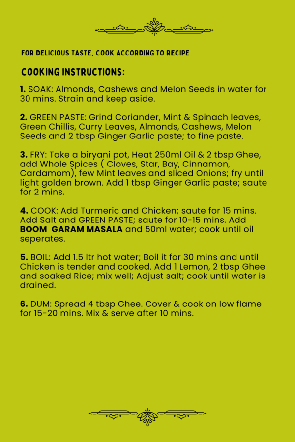 Add BOOM GARAM MASALA and 50ml water. Cook until oil separates from the masala.