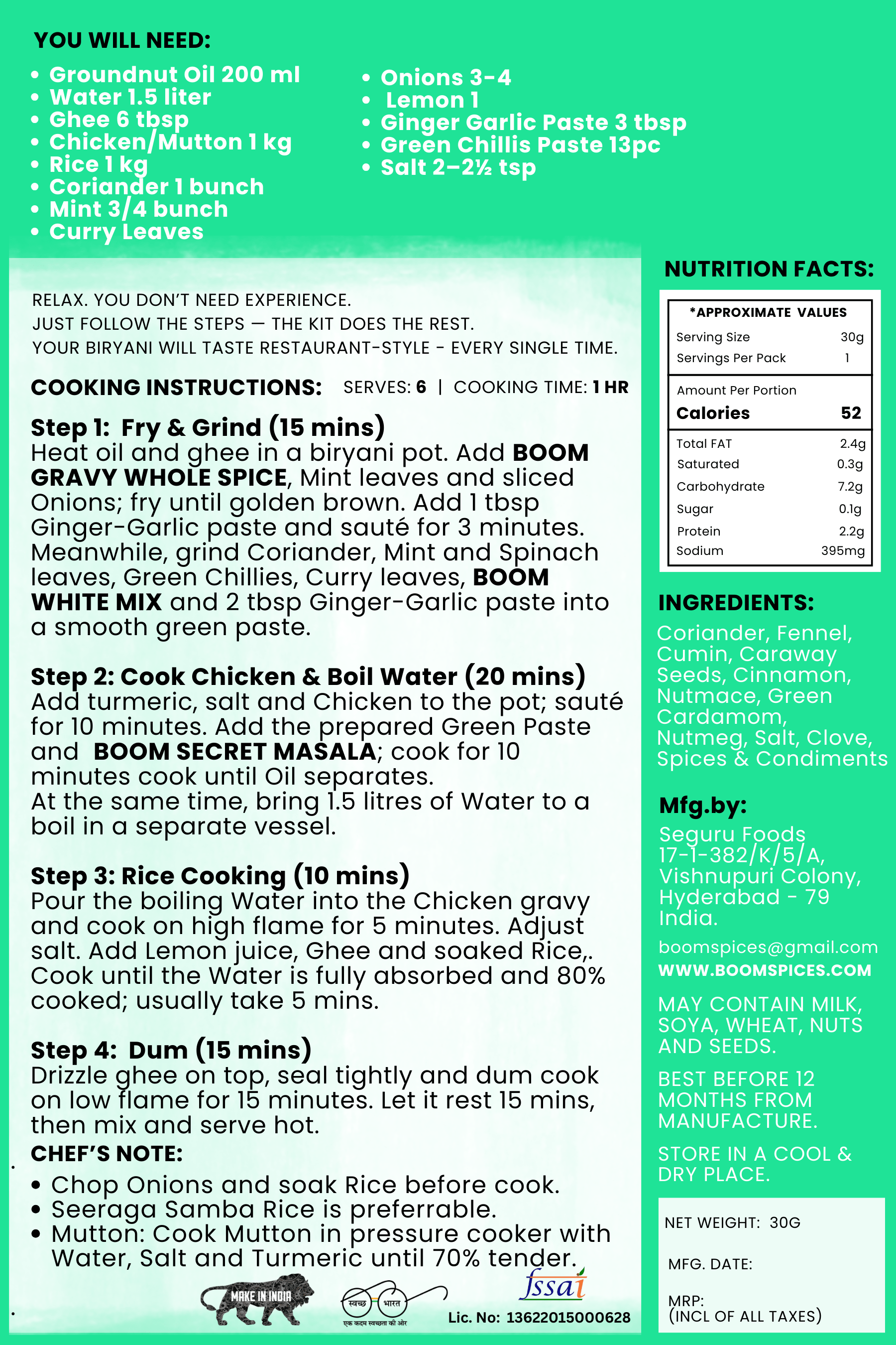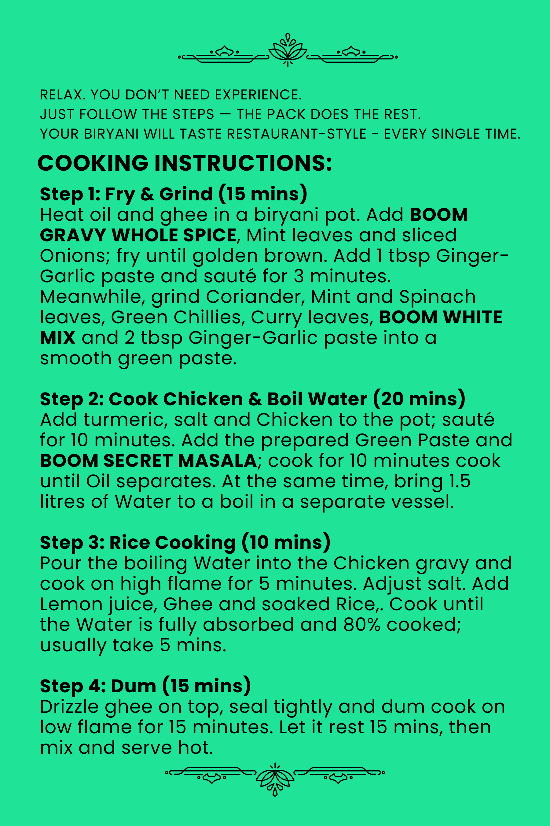 Add turmeric, salt and Chicken to the pot; sauté for 10 minutes. Add the prepared Green Paste and BOOM SECRET MASALA; cook for 10 minutes cook until Oil separates.