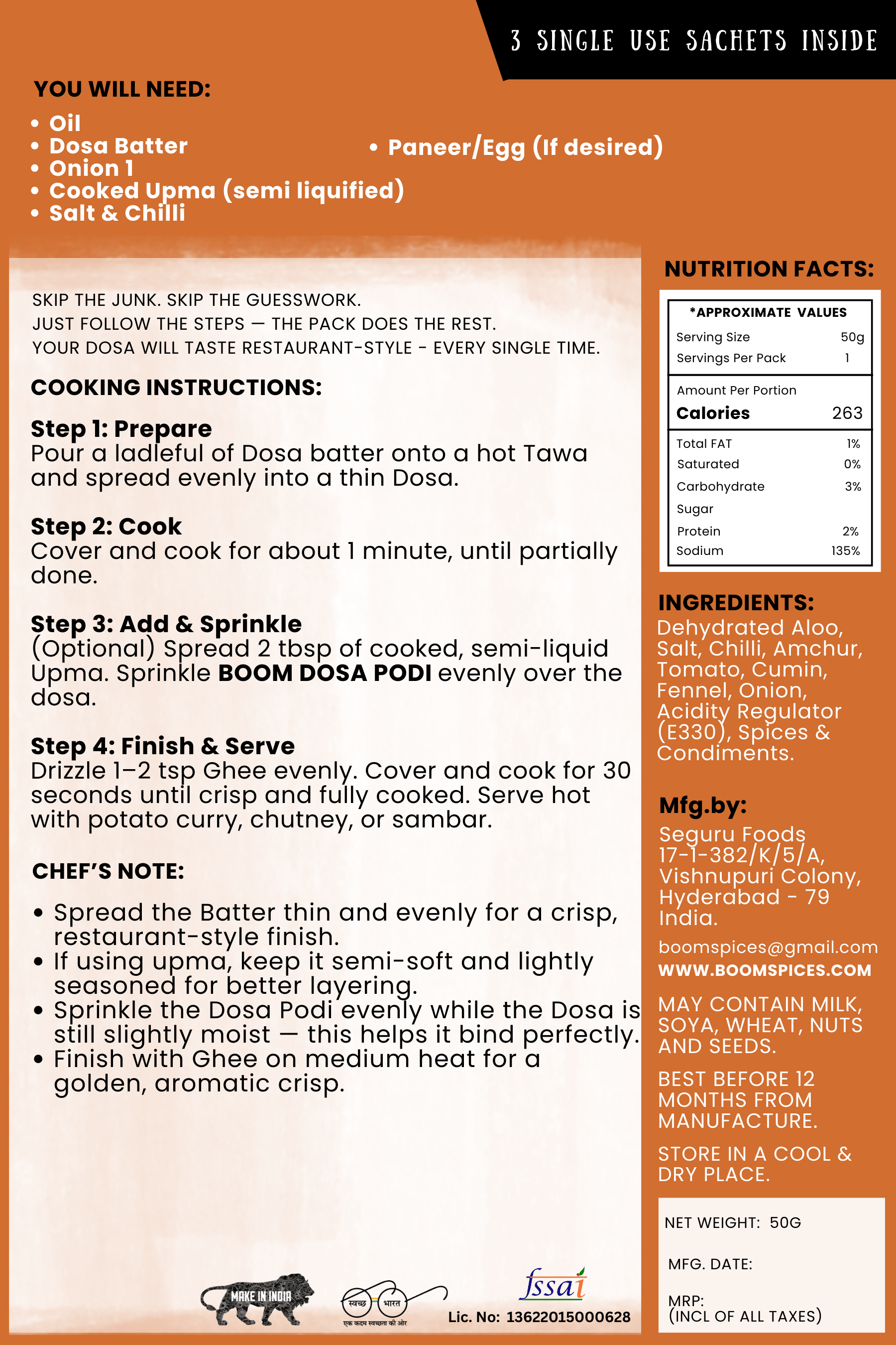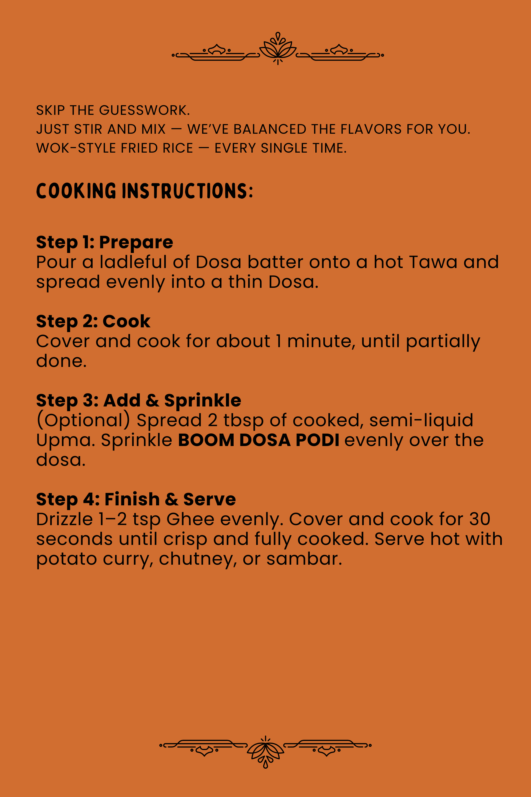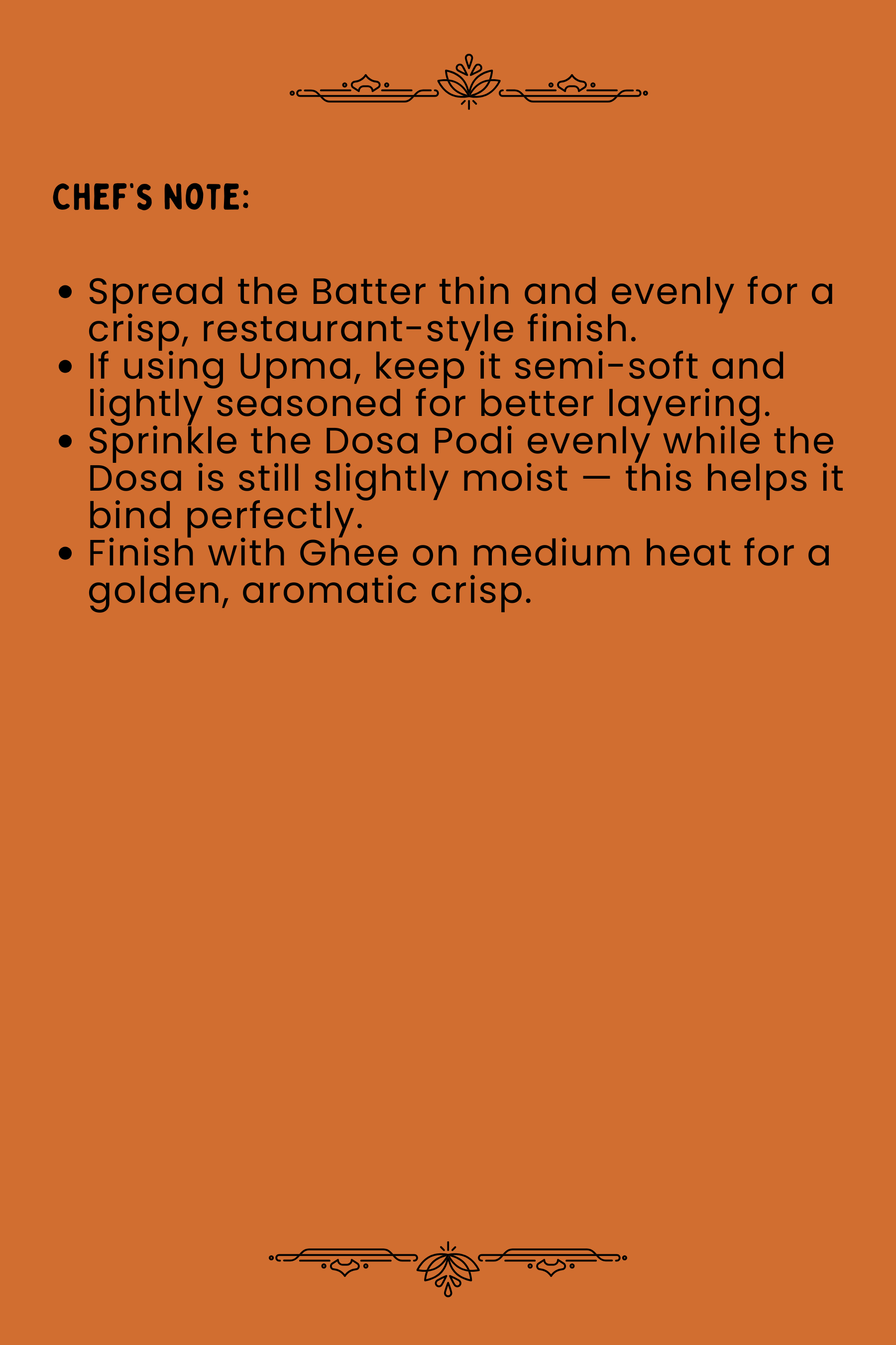 (Optional) Spread 2 tbsp of cooked, semi-liquid Upma. Sprinkle BOOM DOSA PODI evenly over the dosa.