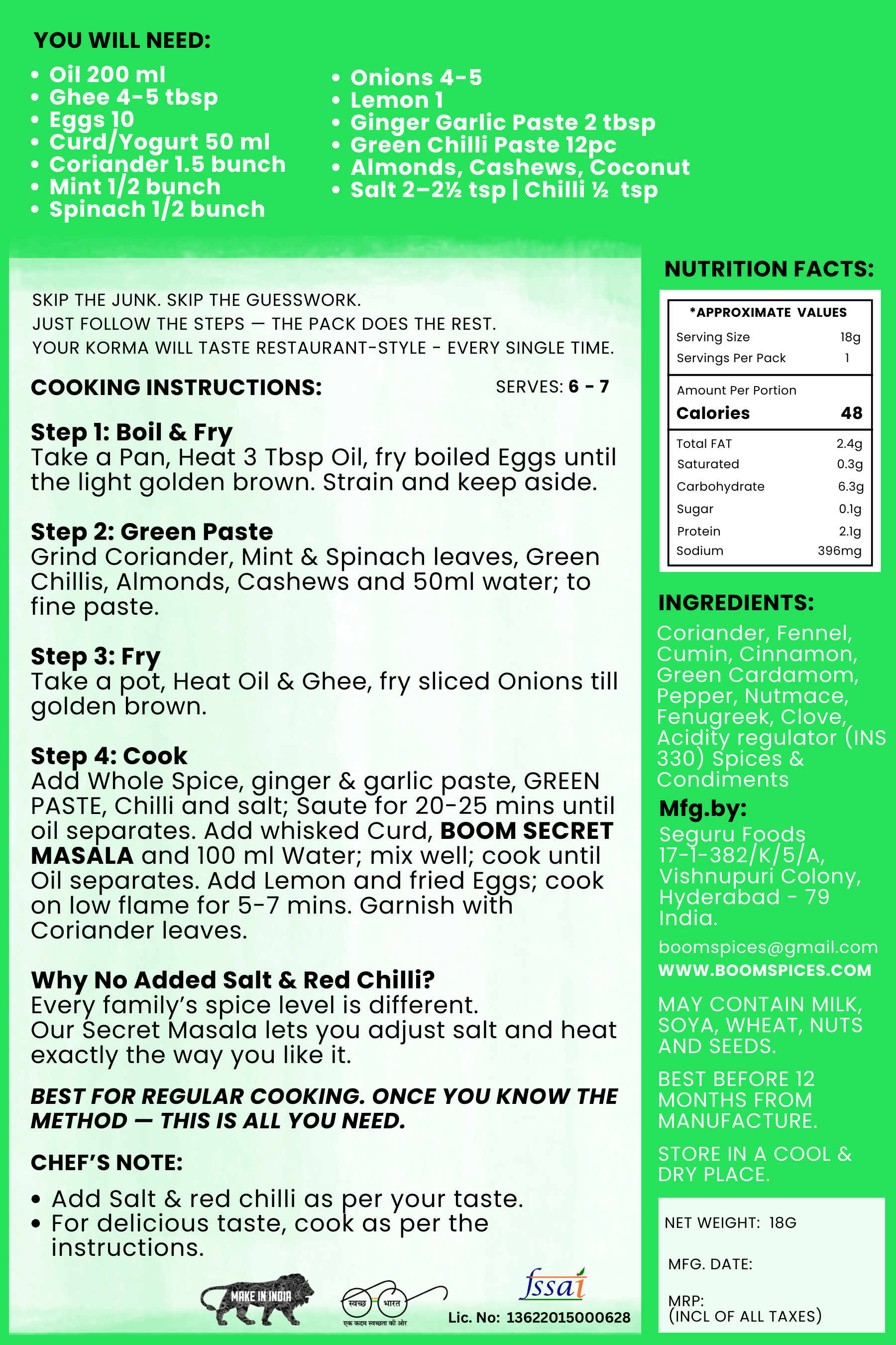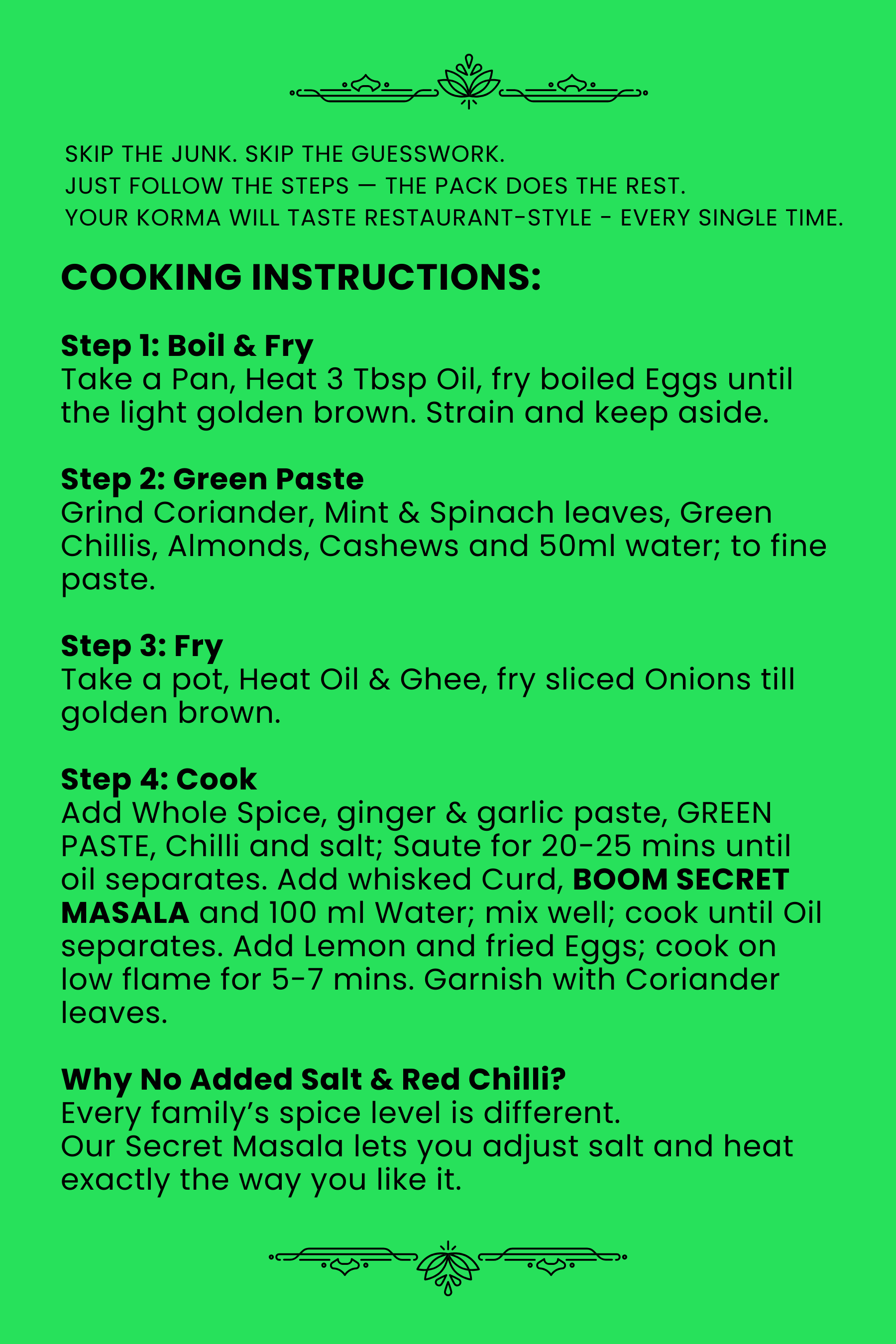 Add Whole Spice, ginger & garlic paste, GREEN PASTE, Chilli and Salt; Saute for 20-25 mins until Oil separates. Add whisked Curd, BOOM SECRET MASALA and 100 ml Water; mix well; cook until Oil separates. Add Lemon and fried Eggs; cook on low flame for 5-7 mins. Garnish with Coriander leaves.