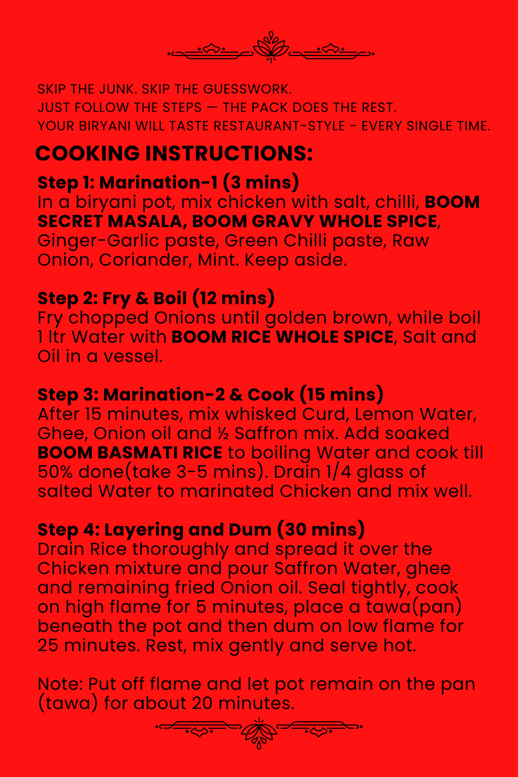In a biryani pot, mix chicken with salt, chilli, BOOM SECRET MASALA, BOOM GRAVY WHOLE SPICE, Ginger-Garlic paste, Green Chilli paste, Raw Onion, Coriander, Mint. Keep aside.