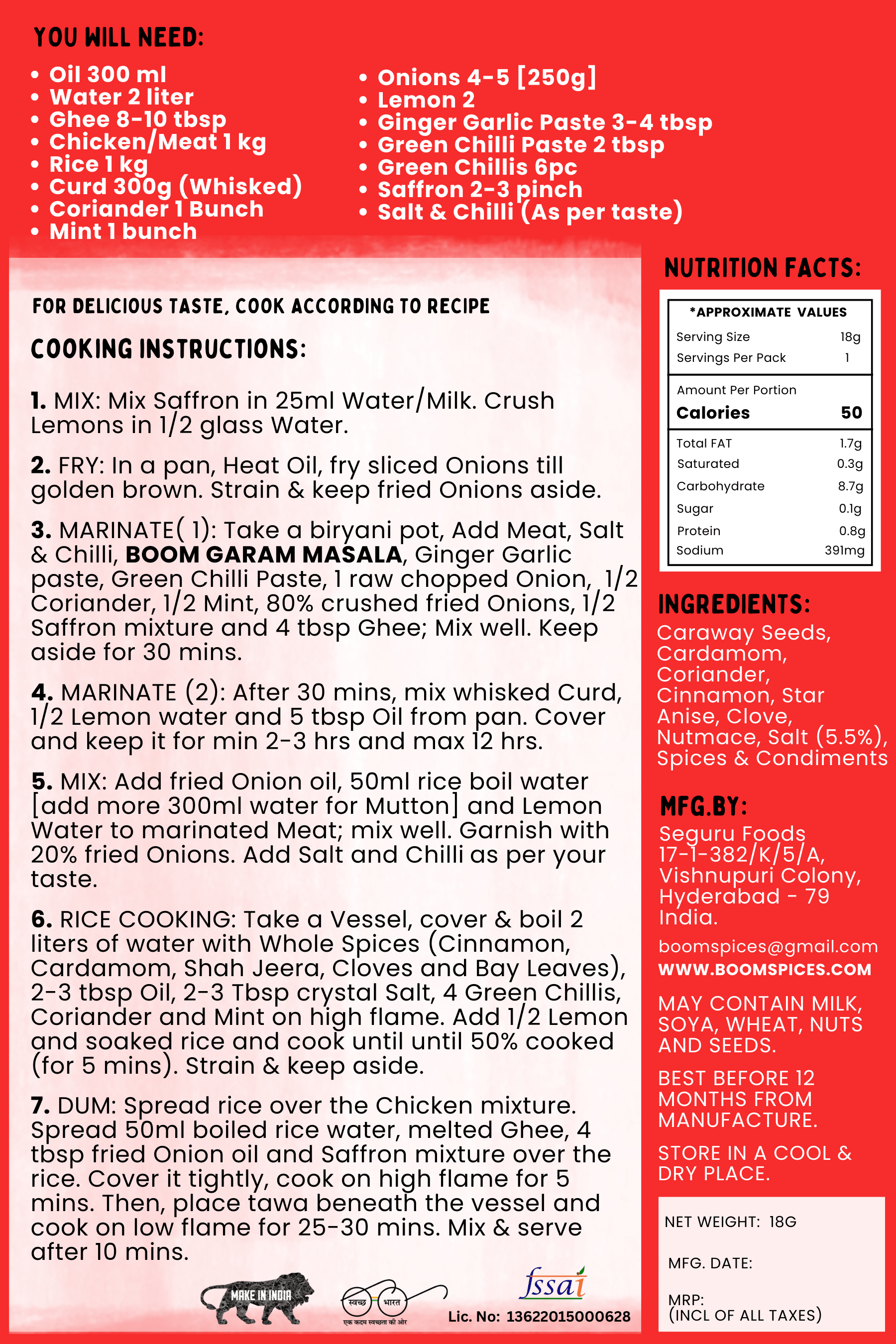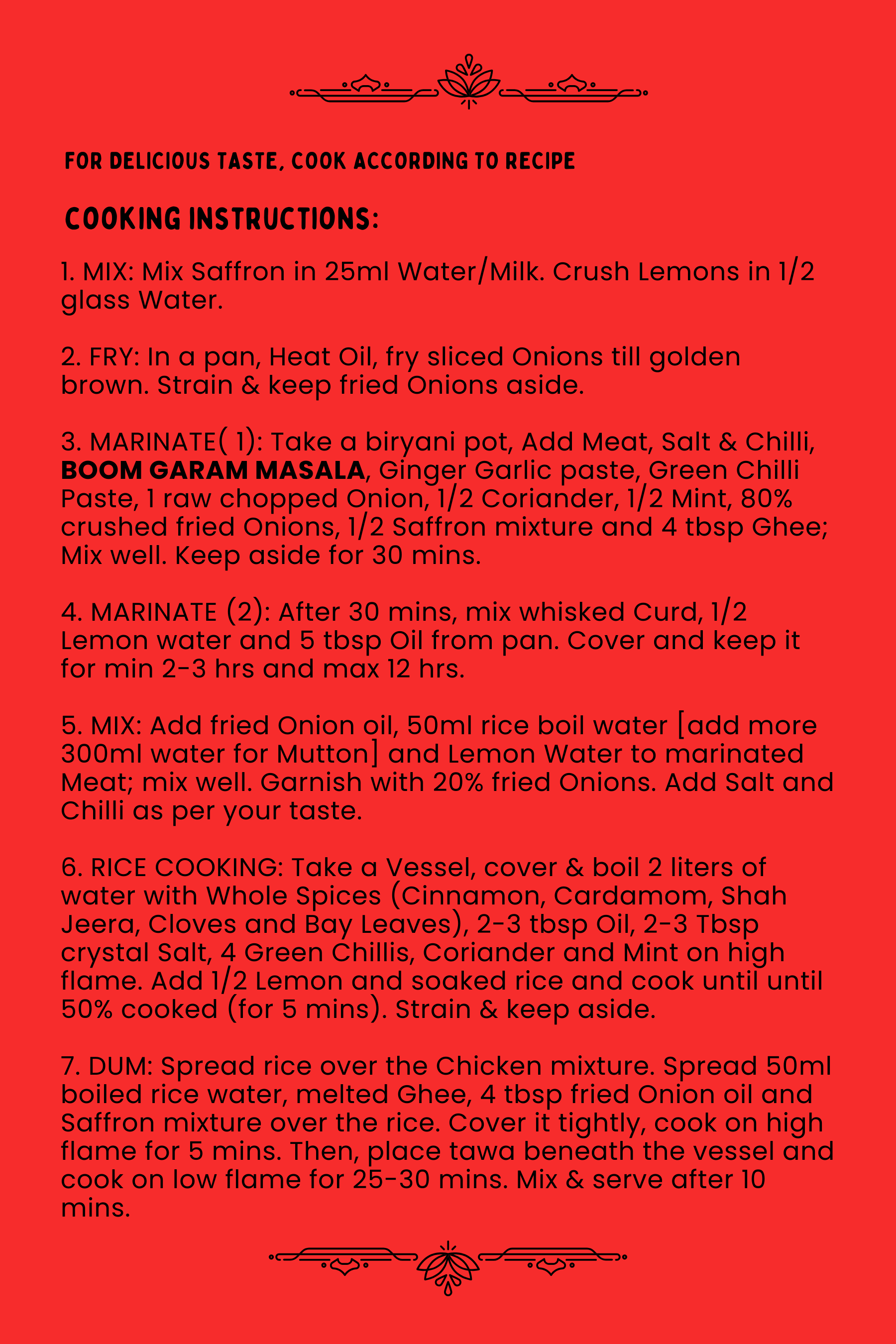 - Mix in BOOM GARAM MASALA, ginger-garlic paste, green chili paste, 1 raw chopped onion, 1/2 of the coriander and mint, 80% of the crushed fried onions, 1/2 of the saffron mixture, and 4 tbsp of ghee.