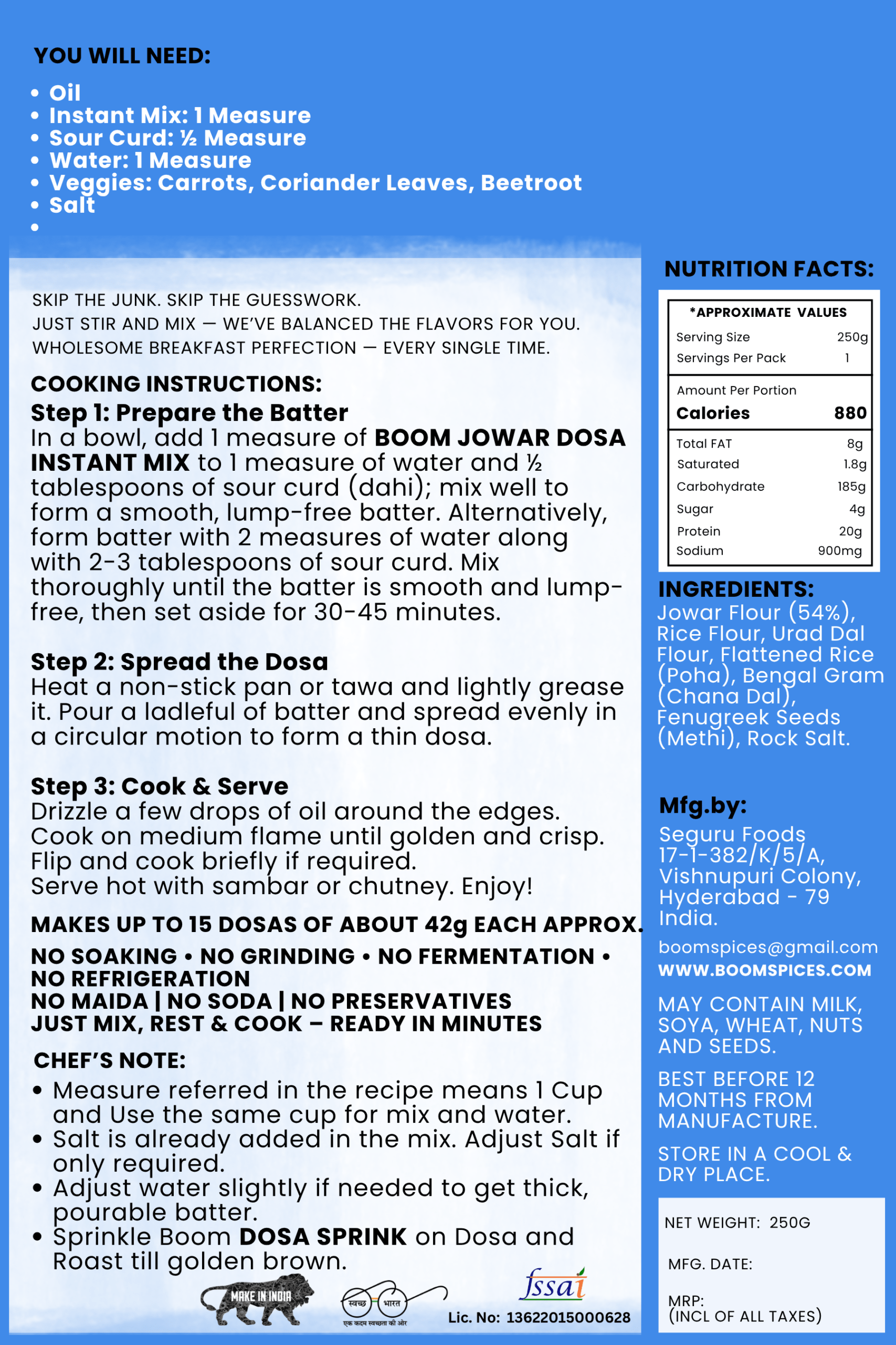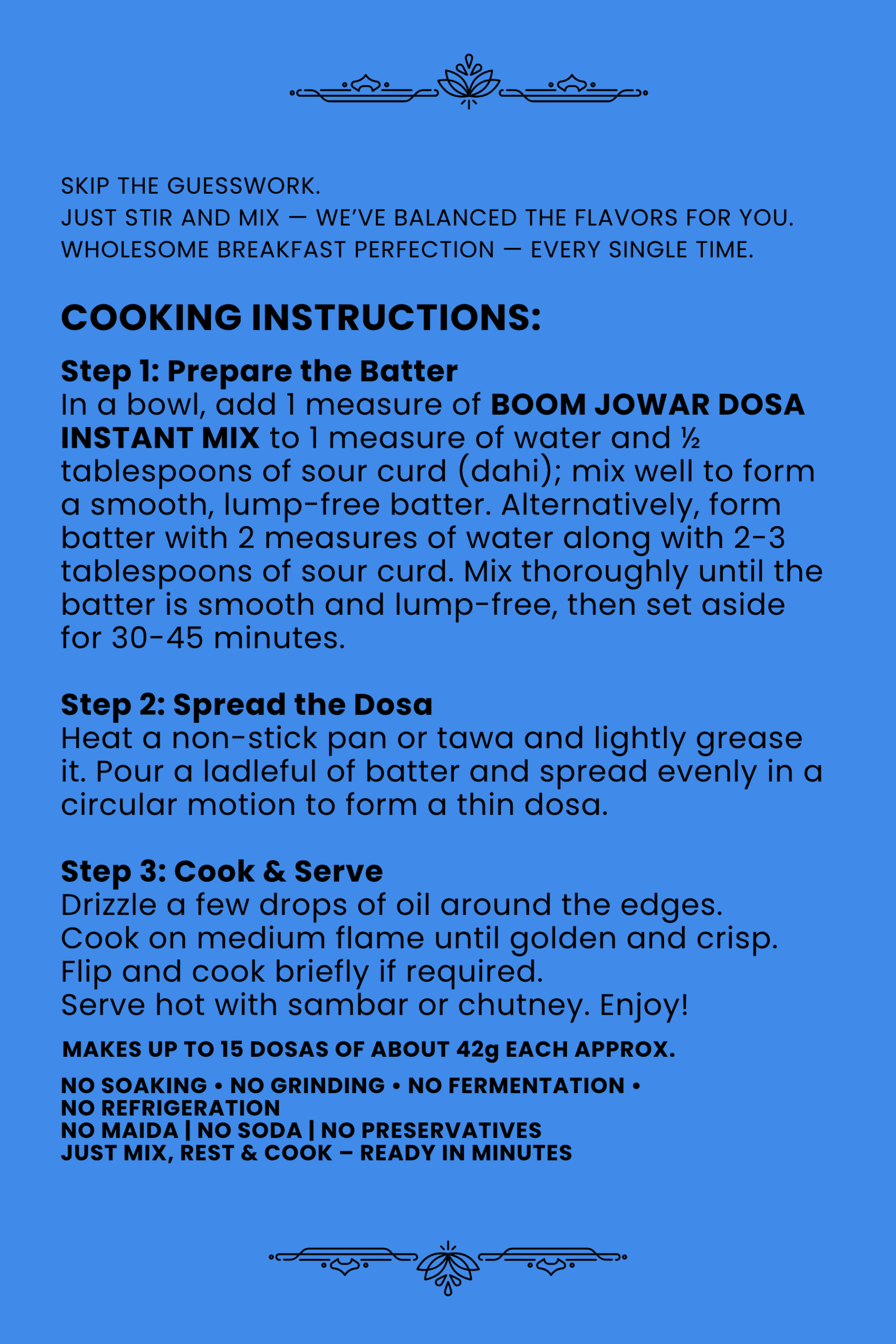 Boom Instant Jowar Dosa Breakfast Mix 250g | Ready to Cook Breakfast | Tasty & Cripsy | No Preservatives, No Soda