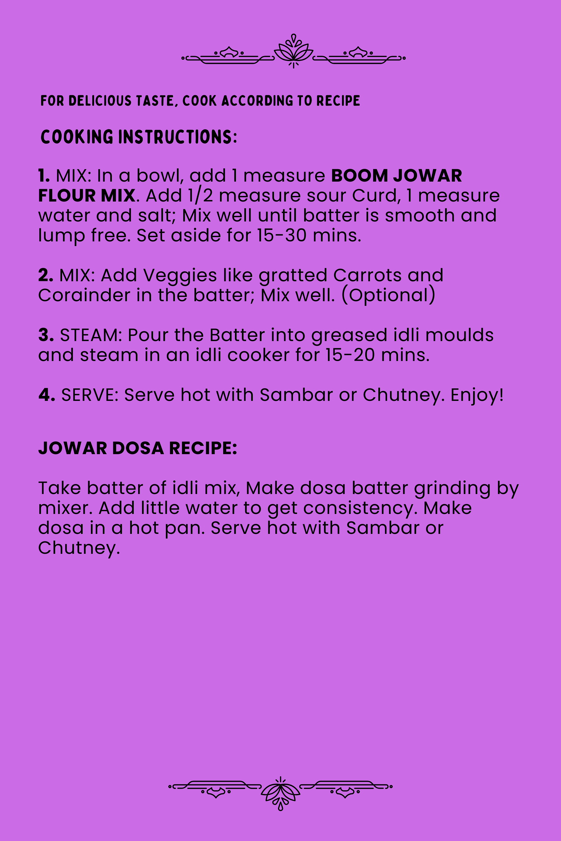 Use the same BOOM Jowar Idly & Dosa Flour Mix batter. Blend it in a mixer to get a smooth dosa batter. Add a little water as needed to adjust the consistency. Pour onto a hot pan and cook like a regular dosa. Serve hot with sambar or chutney.