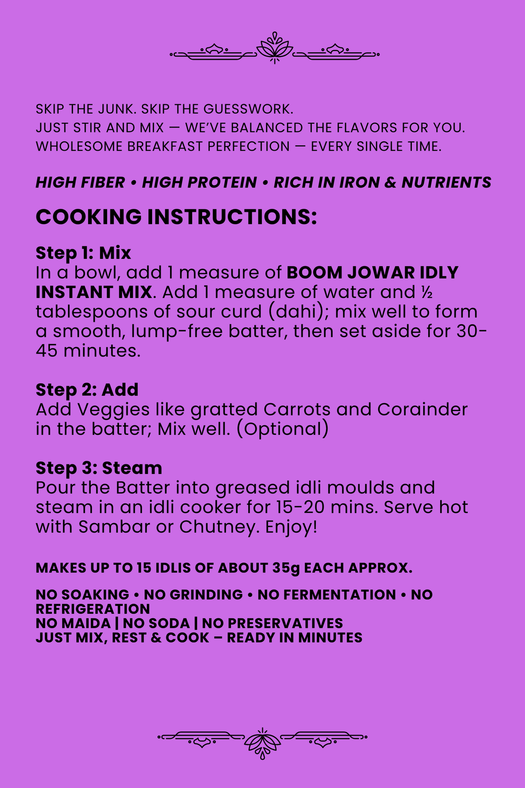 n a bowl, add 1 measure of BOOM JOWAR IDLY INSTANT MIX. Add 1 measure of water and ½ tablespoons of sour curd (dahi); mix well to form a smooth, lump-free batter, then set aside for 30-45 minutes.
