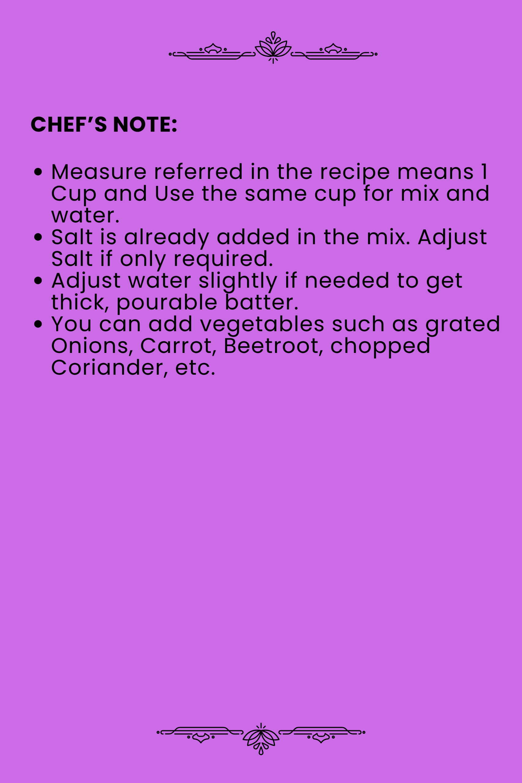- Salt is already added in the mix. Adjust Salt if only required.