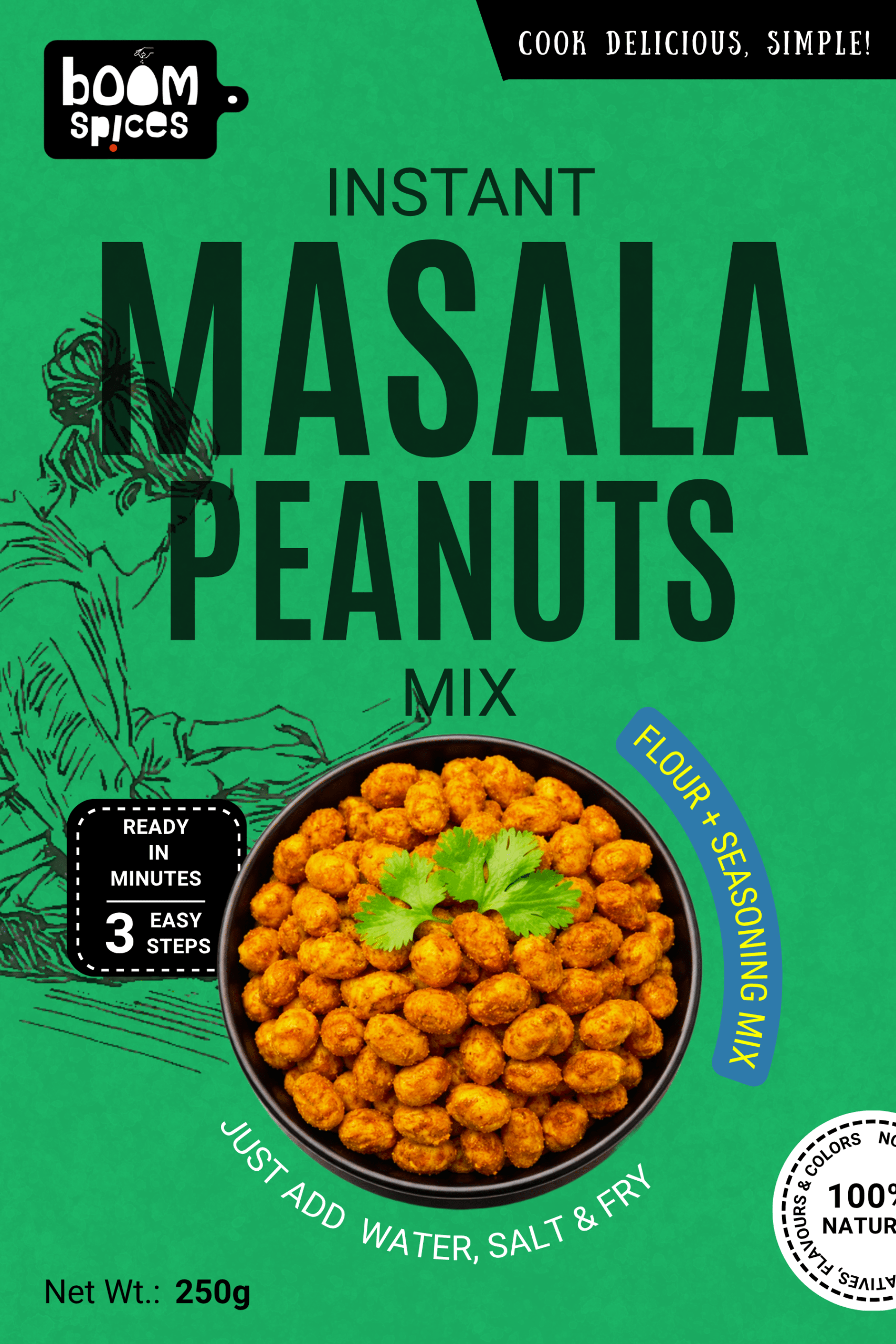 Sprinkle BOOM MASALA PEANUTS MIX, Salt and Chilli over them. Add little water and toss well to evenly coat the peanuts with a thick masala layer.