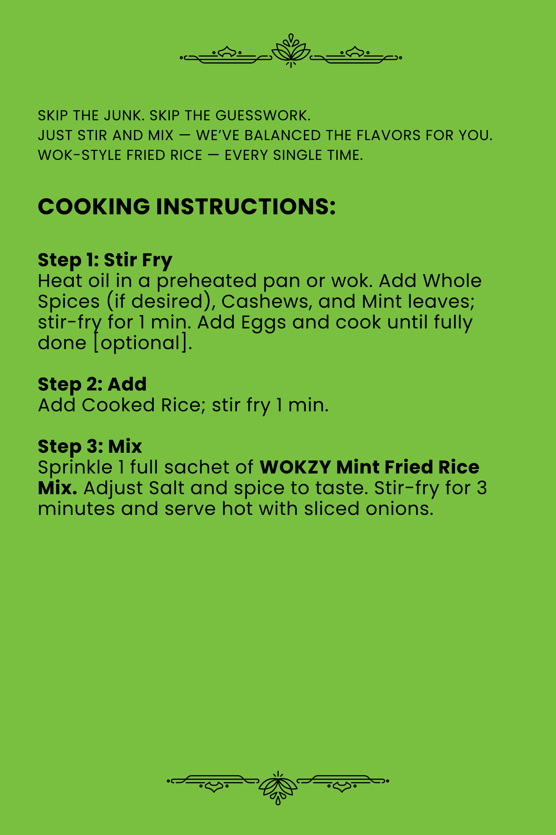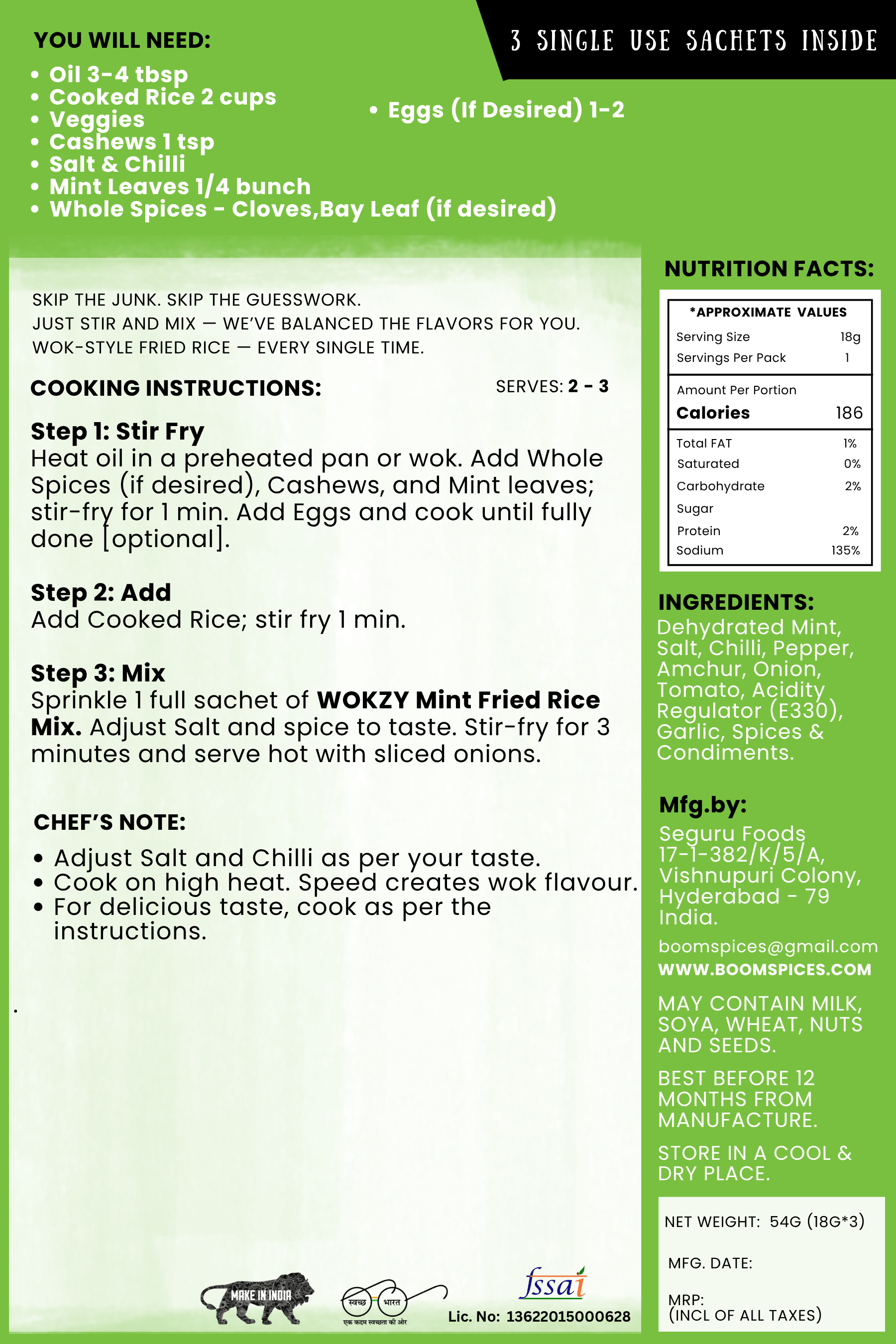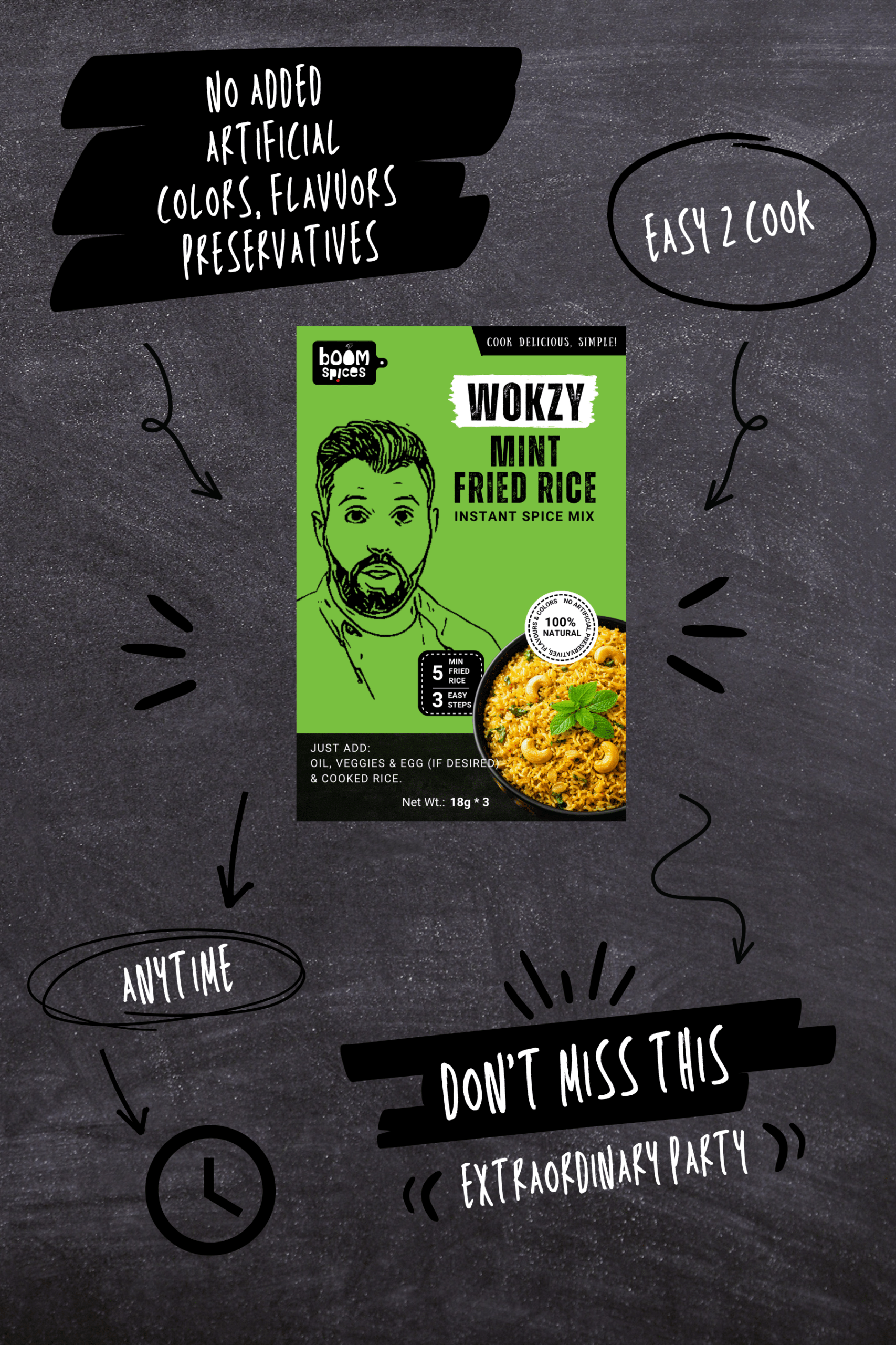 Sprinkle 1 full sachet of Boom WOKSY Mint Fried Rice Instant Spice Mix. Adjust Salt and spice to taste. Stir-fry for 3 minutes and serve hot with sliced Onions.