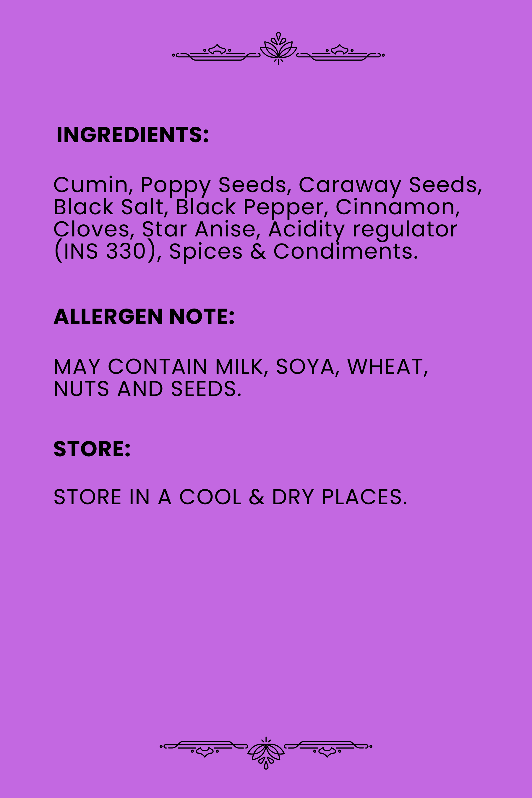 Cumin, Poppy Seeds, Caraway Seeds, Black Salt, Black Pepper, Cinnamon, Cloves, Star Anise, Acidity regulator (INS 330), Spices & Condiments