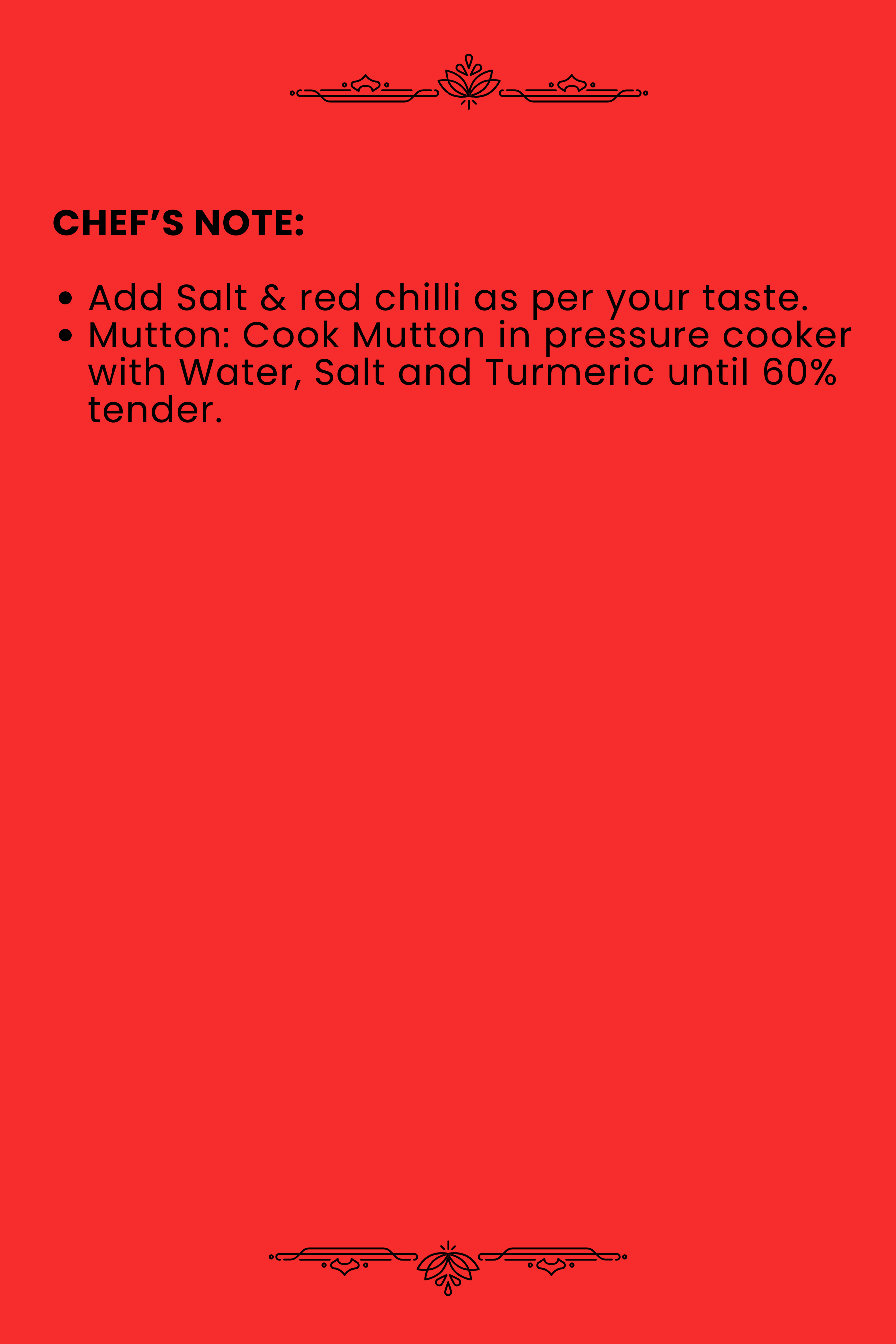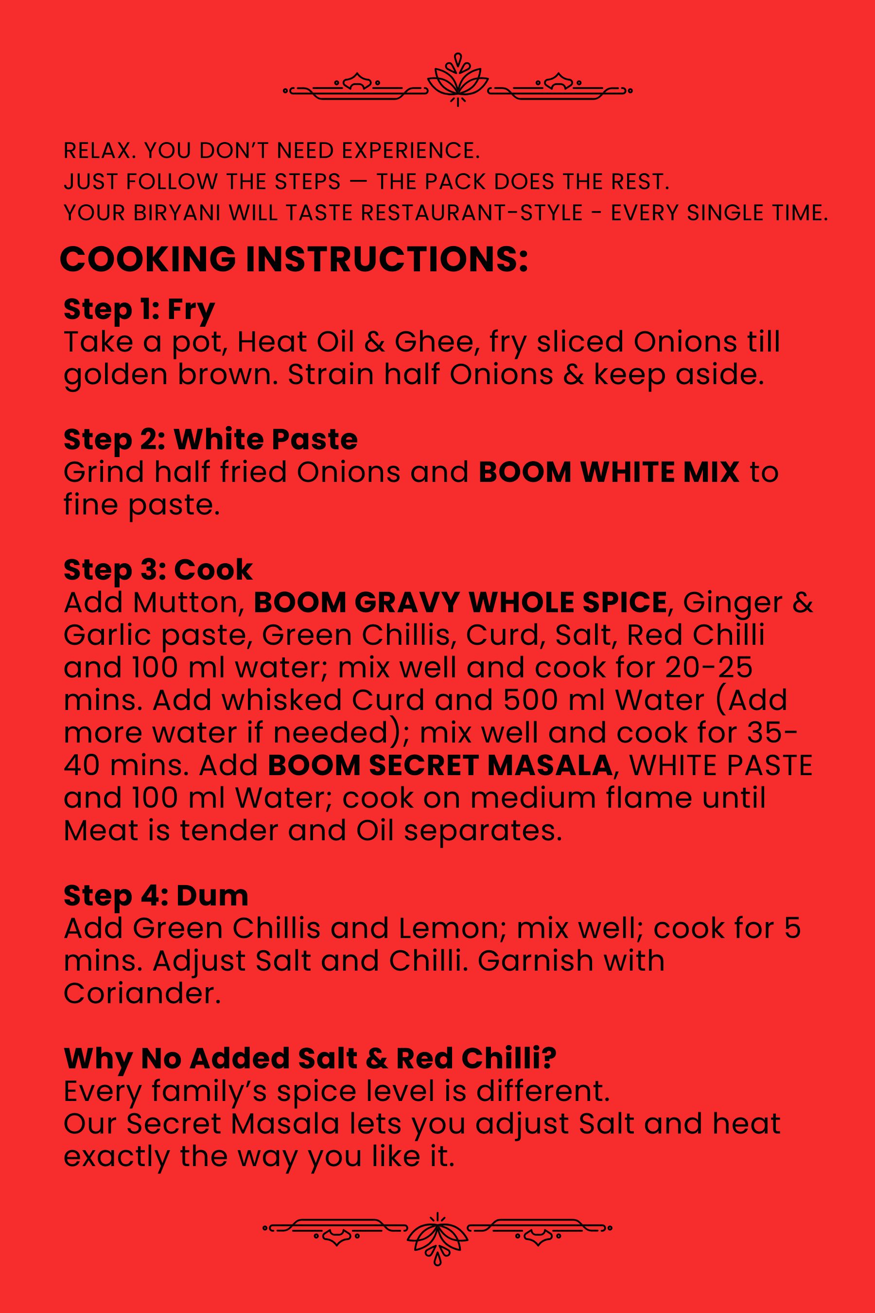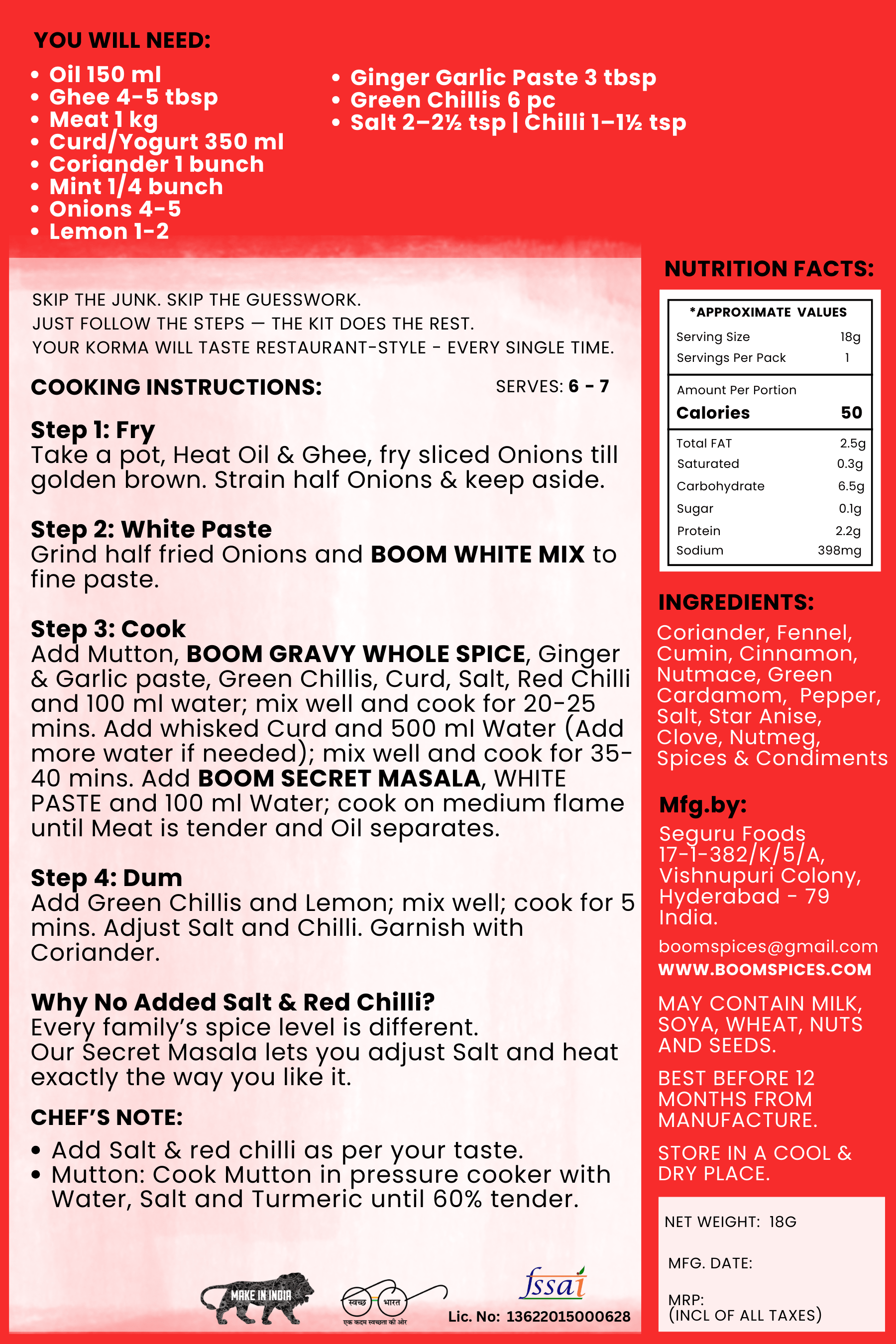 Add Mutton, BOOM GRAVY WHOLE SPICE, Ginger & Garlic paste, Green Chillis, Curd, Salt, Red Chilli and 100 ml water; mix well and cook for 20-25 mins. Add whisked Curd and 500 ml Water (Add more water if needed); mix well and cook for 35-40 mins. Add BOOM MUTTON KORMA SECRET MASALA, WHITE PASTE and 100 ml Water; cook on medium flame until Meat is tender and Oil separates.