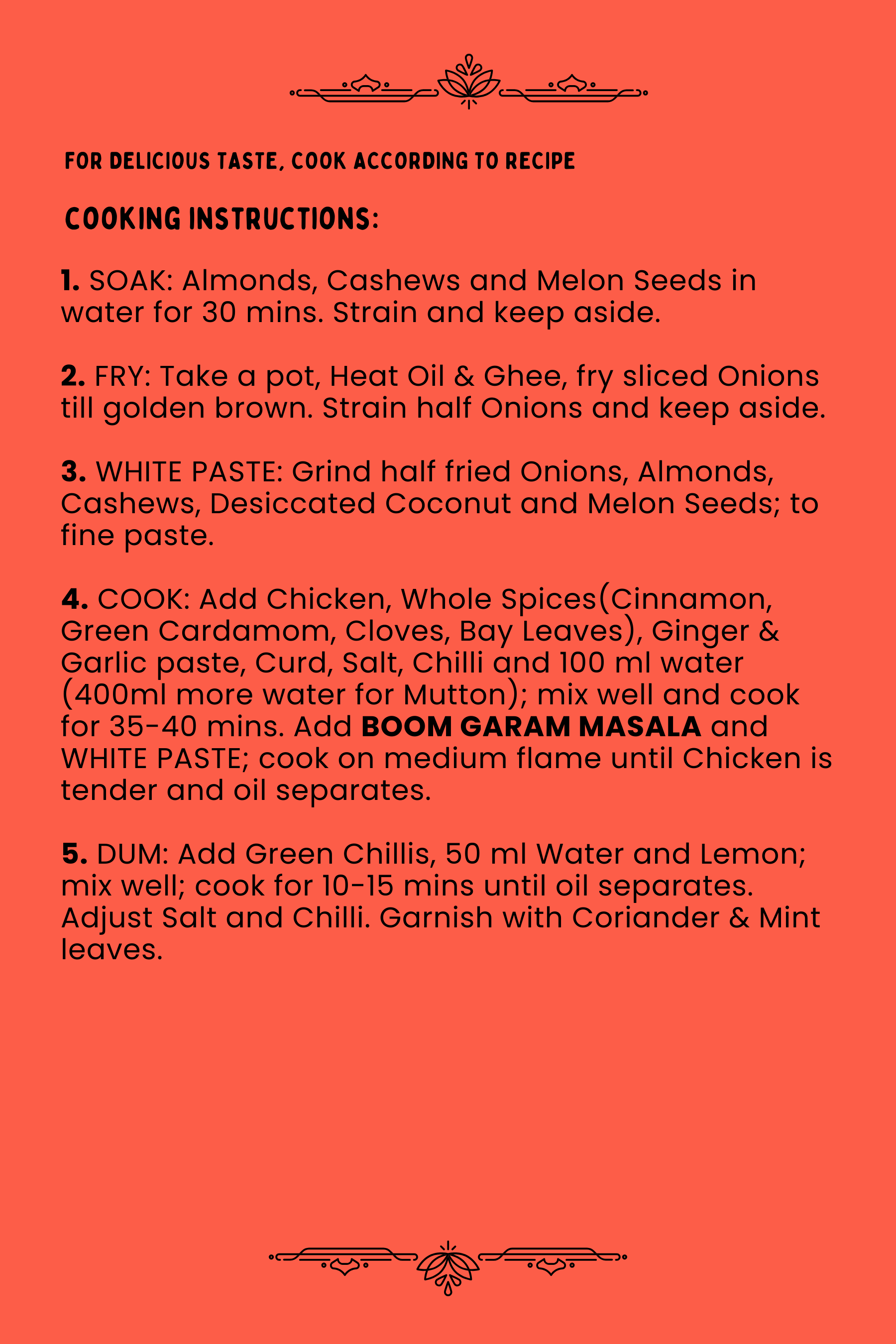 Once the chicken is partially cooked, add the white paste and a spoon of Boom Garam Masala.