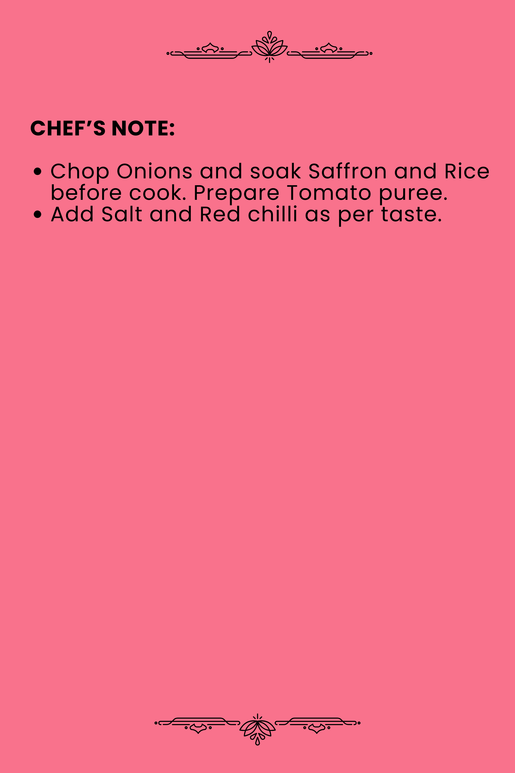 Add Ghee and Paneer; Saute until Oil separates. Garnish with Lemon juice, half Saffron Milk, Mint & Coriander.