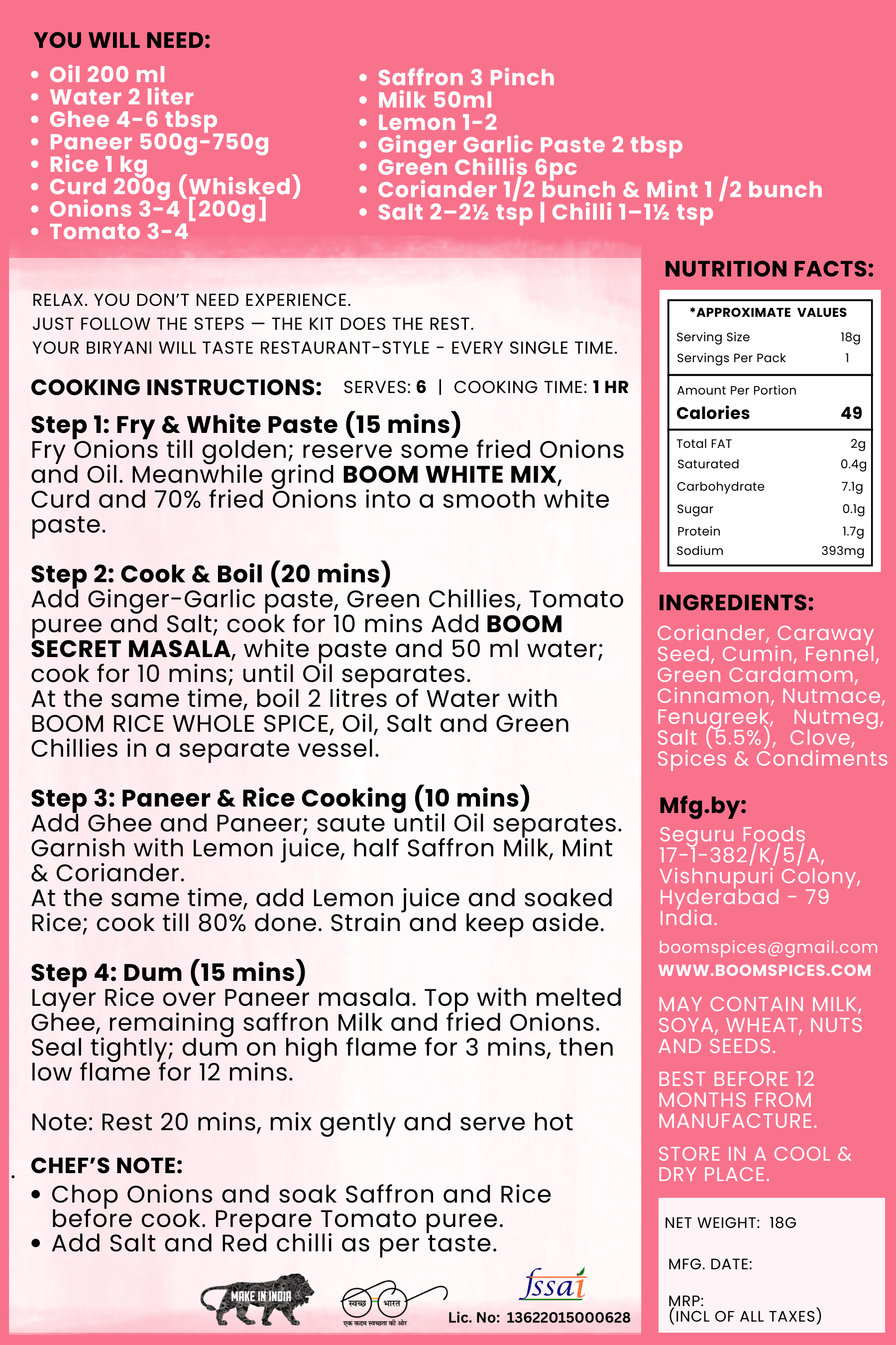Boom Paneer Biryani Masala Kit includes (3) Sachets: