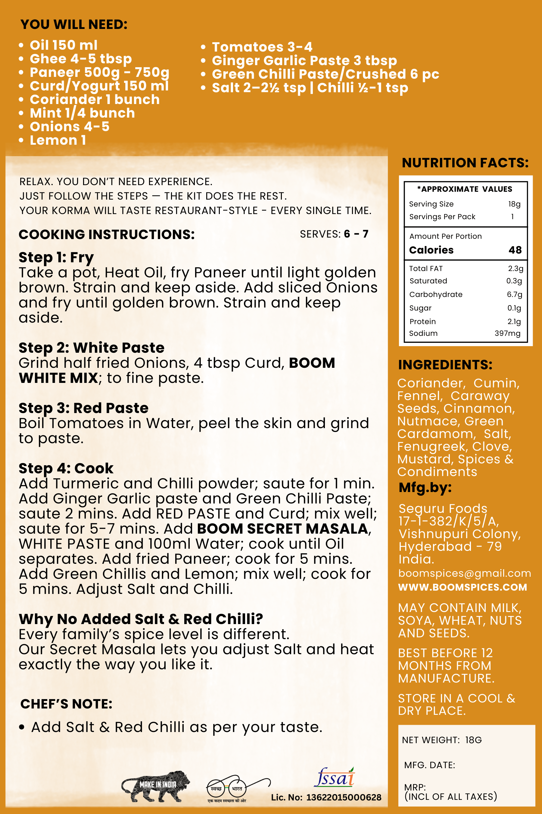 Boom Paneer Korma Masala Kit includes: