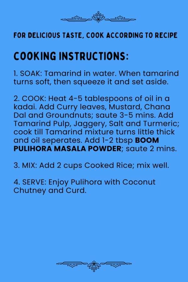 Now, add 1–2 tablespoons of Boom Pulihora Masala Powder and sauté for another 2 minutes.3. Mix