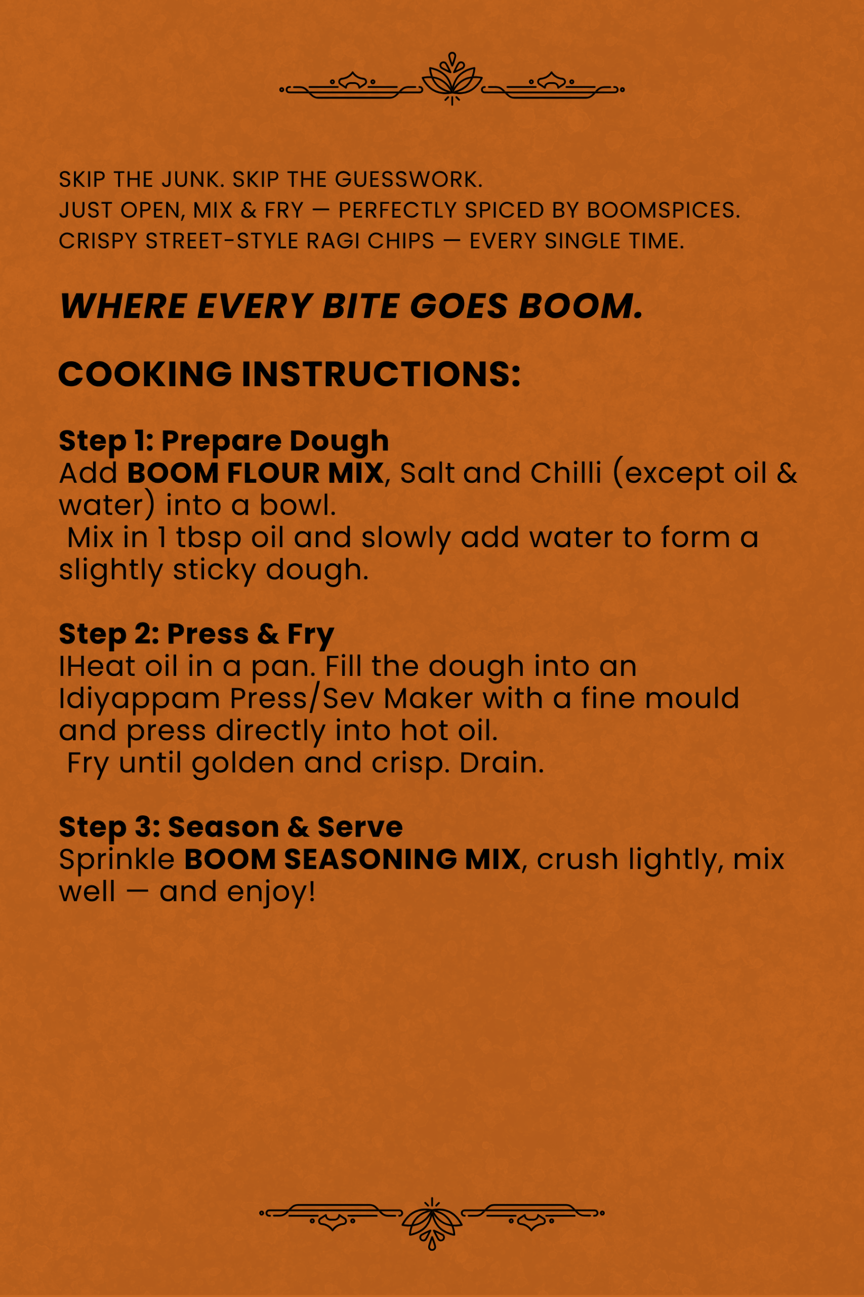 Add BOOM RAGI CHIPS MIX, Salt and Chilli (except oil & water) into a bowl.