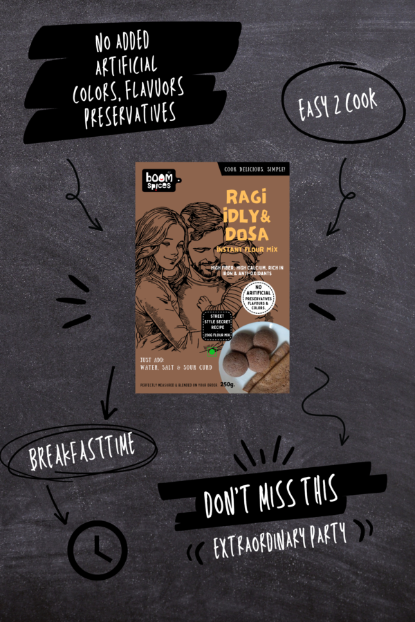 In a bowl, combine 1 measure of BOOM RAGI FLOUR MIX with ½ measure of sour curd, 1 measure of water, and salt to taste. Mix thoroughly until the batter is smooth and free of lumps. Let it rest for 15–30 minutes.