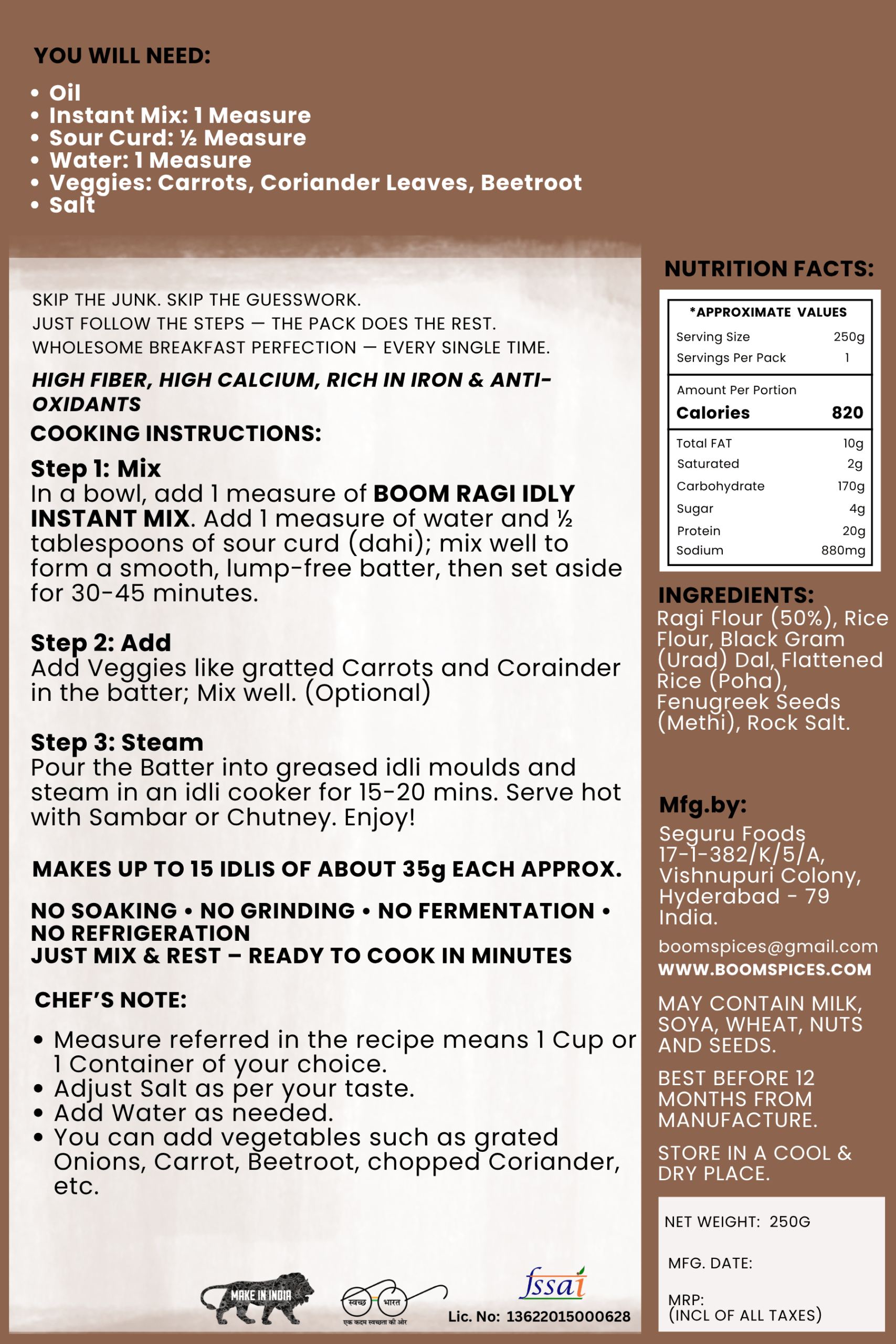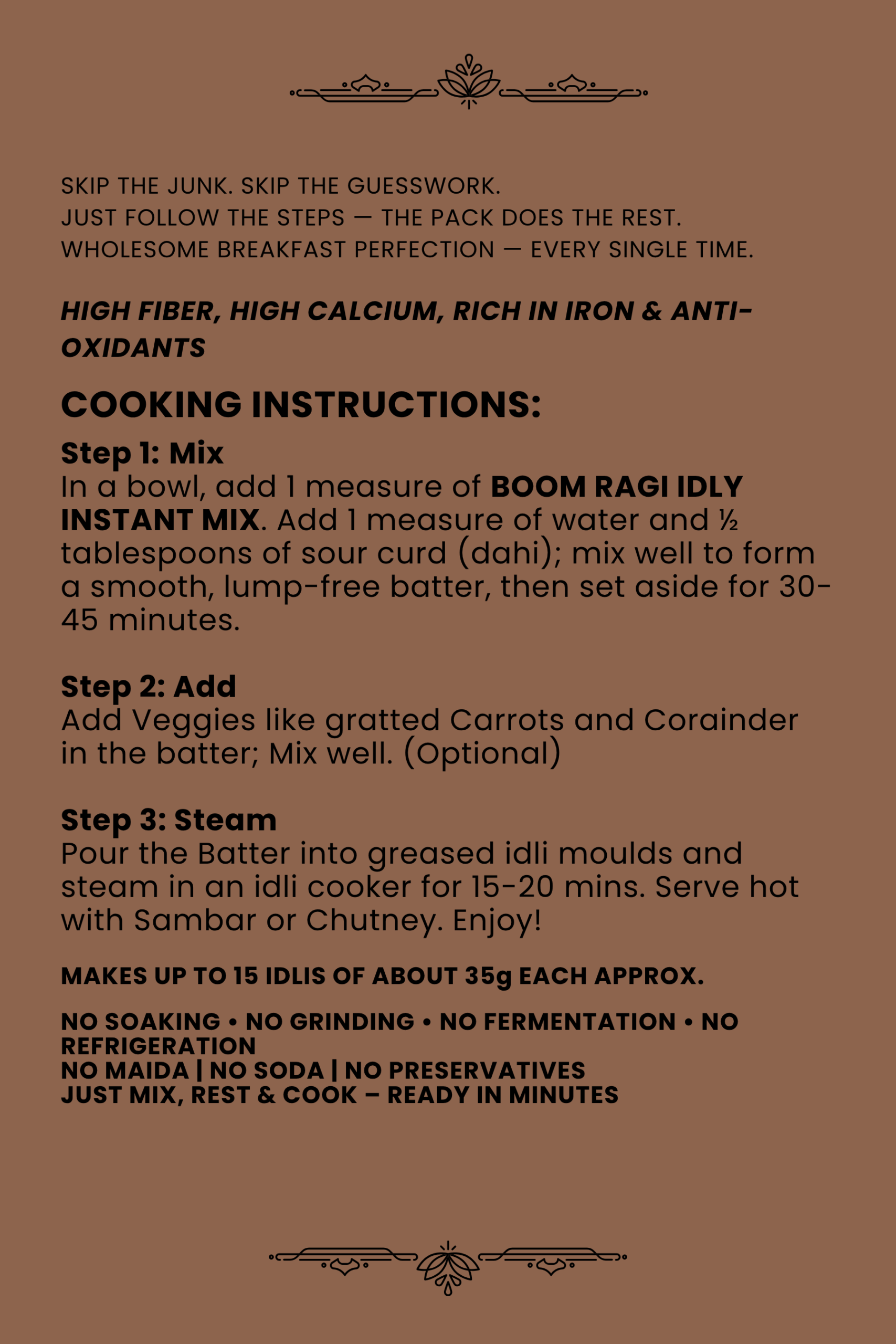 In a bowl, add 1 measure of BOOM RAGI IDLY INSTANT MIX. Add 1 measure of water and ½ tablespoons of sour curd (Dahi); mix well to form a smooth, lump-free batter, then set aside for 30-45 minutes.
