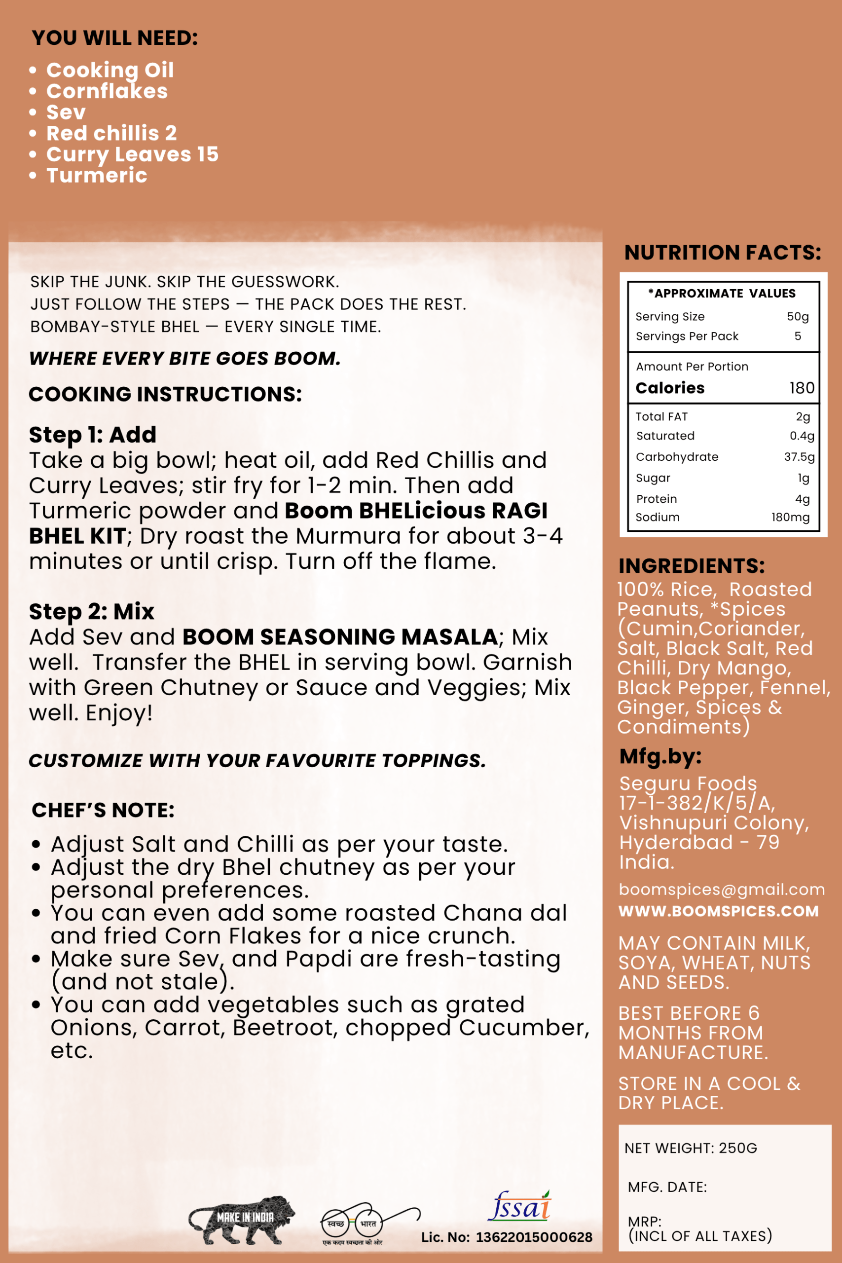 Take a big bowl; heat oil, add Red Chillis and Curry Leaves; stir fry for 1-2 min. Then add Turmeric powder and Boom BHELicious RAGI BHEL KIT; Dry roast the Murmura (Puffed Rice) for about 3-4 minutes or until crisp. Turn off the flame.