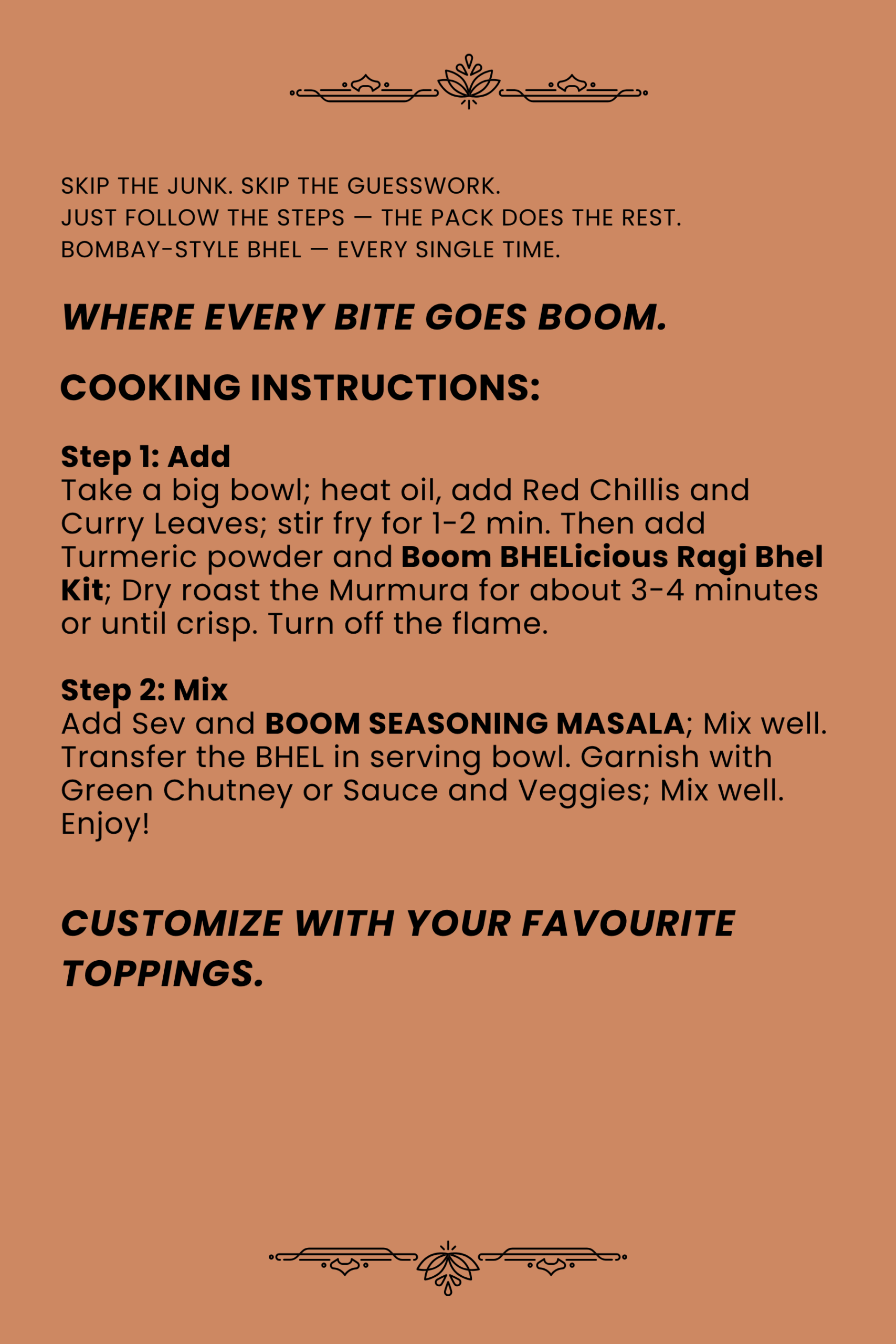 Add Sev and Boom BHELicious SEASONING MASALA; Mix well. Transfer the BHEL in serving bowl. Garnish with Green Chutney or Sauce and Veggies; Mix well. Enjoy!