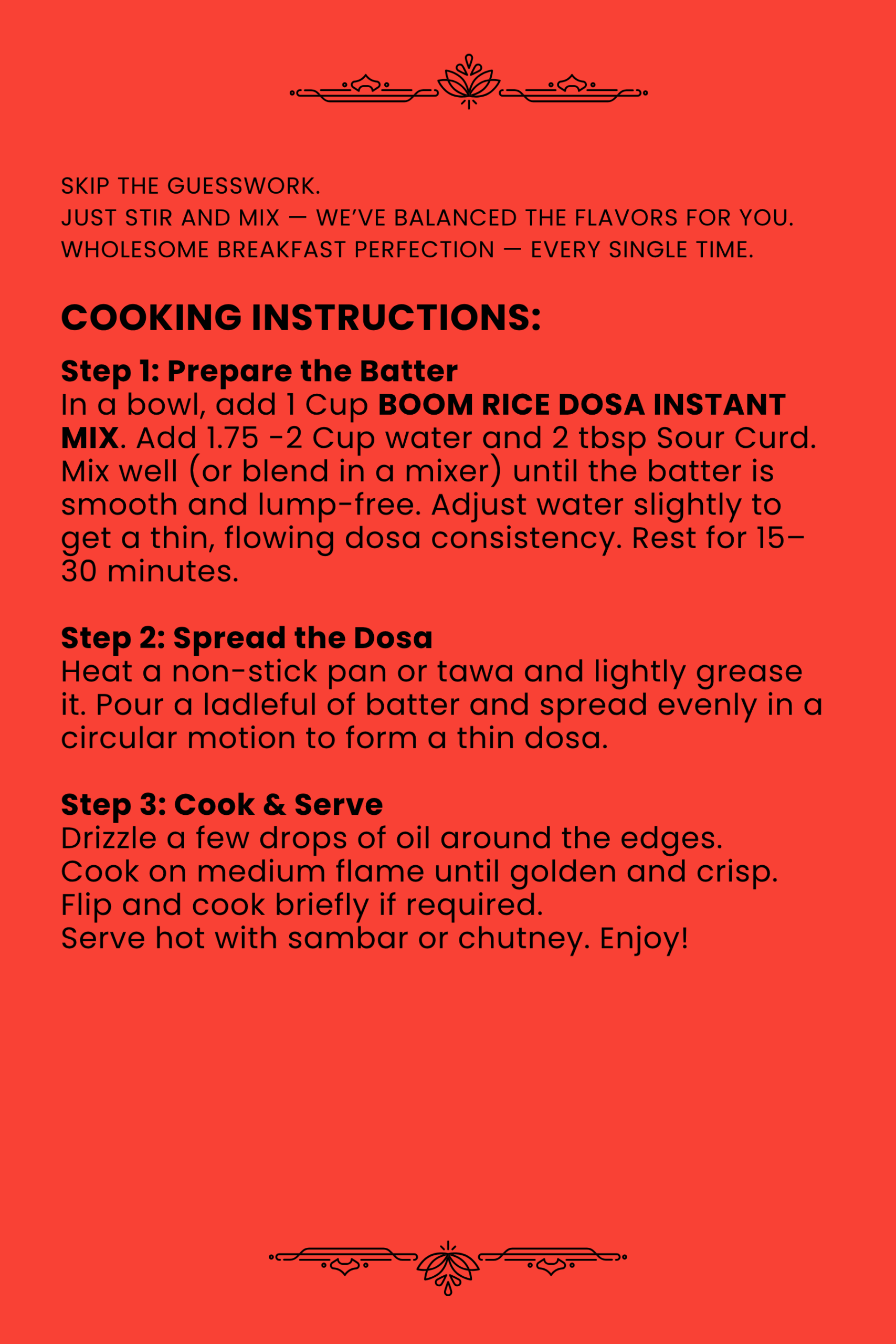 In a bowl, add 1 Cup BOOM RICE DOSA INSTANT MIX. Add 1.75 -2 Cup water and 2 tbsp Sour Curd. Mix well (or blend in a mixer) until the batter is smooth and lump-free. Adjust water slightly to get a thin, flowing dosa consistency. Rest for 15–30 minutes.