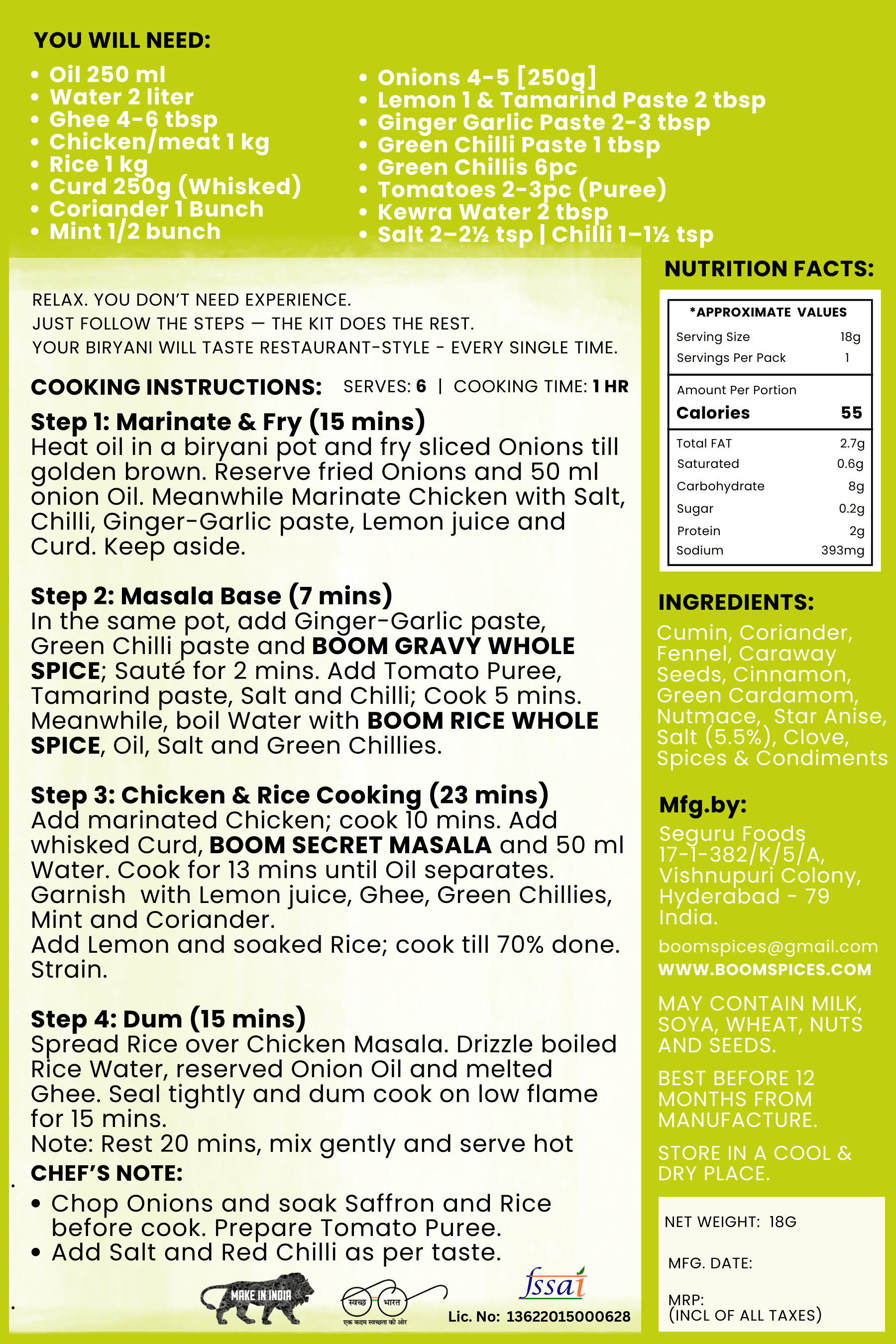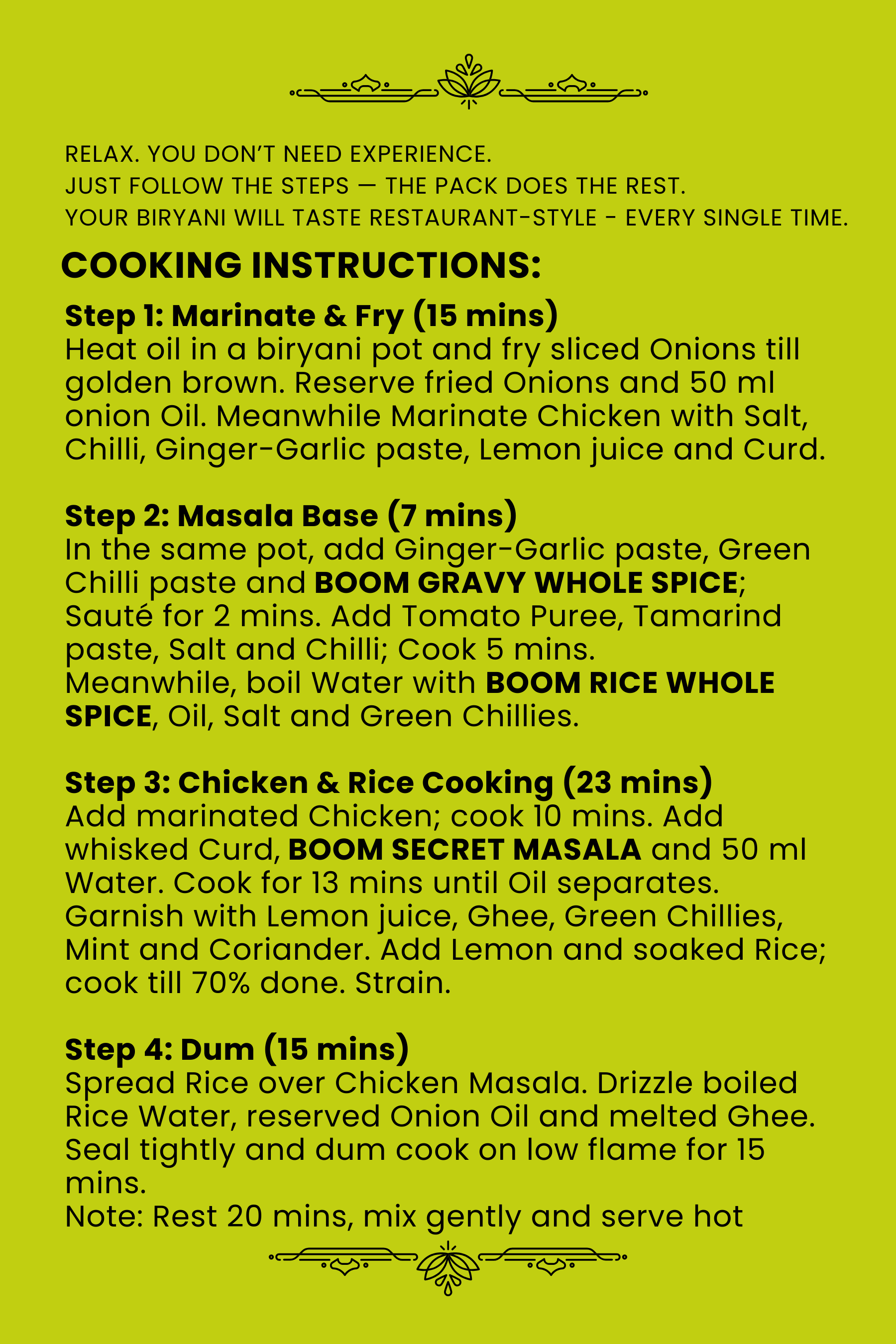 Add marinated Chicken; cook 10 mins. Add whisked Curd, BOOM SECRET MASALA and 50 ml Water. Cook for 13 mins until Oil separates. Garnish with Lemon juice, Ghee, Green Chillies, Mint and Coriander.