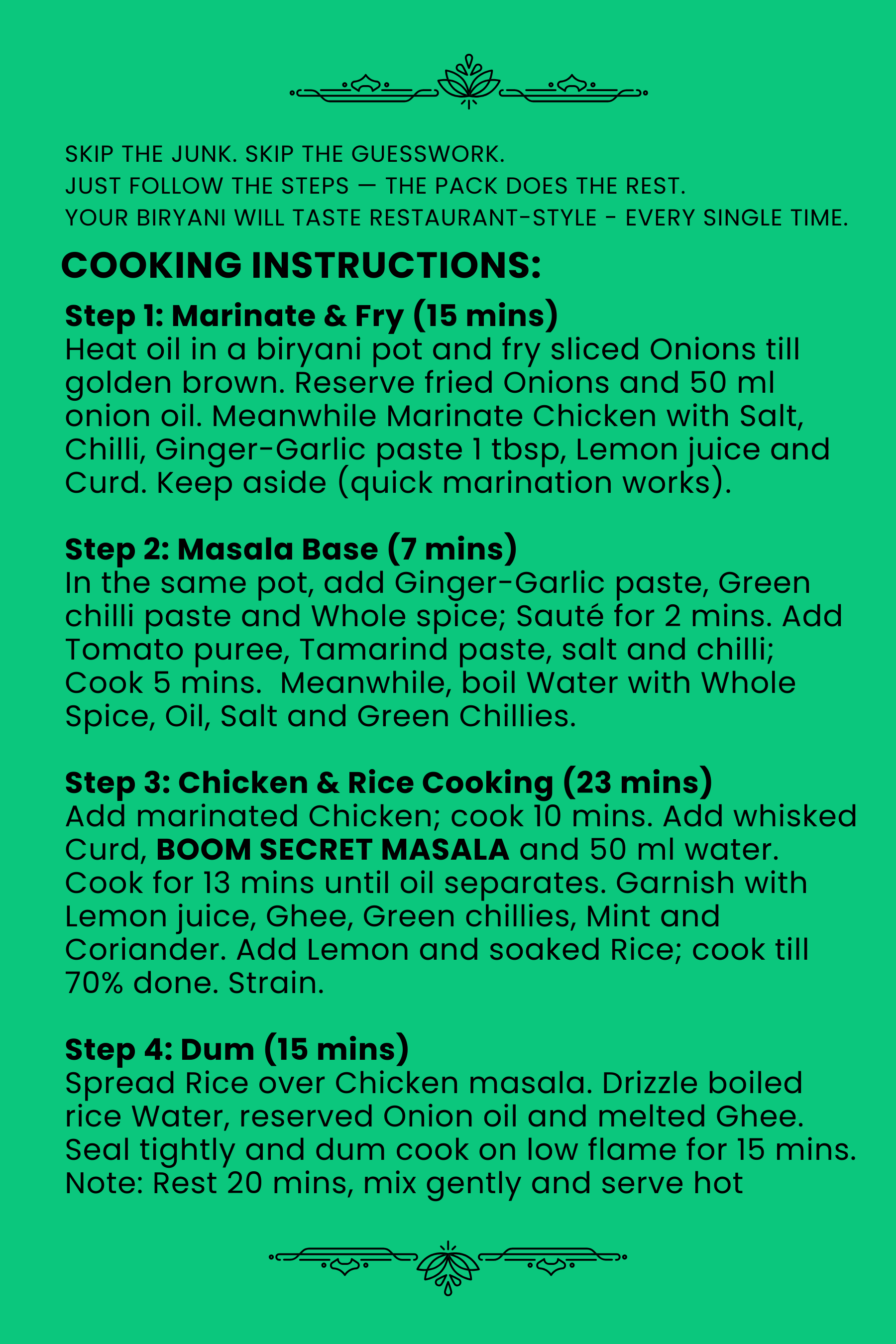 Add marinated Chicken; cook 10 mins. Add whisked Curd, BOOM SECRET MASALA and 50 ml water. Cook for 13 mins until oil separates. Garnish with Lemon juice, Ghee, Green Chillies, Mint and Coriander.
